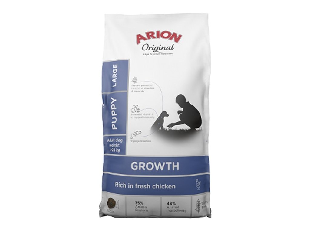 Arion Original Growth je kompletní krmivo pro štěňata velkých plemen. Bezlepková receptura na bázi kuřecího obsahuje vysoce stravitelné kuřecí, prebiotika a probiotika, chondroprotektiva a potřebné množství vitaminů a minerálních látek pro zajištění správného růstu vašeho psa.Složení: Kuřecí maso 37 % (z toho 14 % čerstvé kuřecí maso a 23 % sušený kuřecí protein), rýže, kukuřice, hrách, živočišný tuk, řepné řízky, hydrolyzovaná živočišná bílkovina, minerální látky, pivovarské kvasnice, rybí tuk, psyllium, kolagen, glukosamin, chondroitin sulfát, ß-glukany, F.O.S., G.O.S., M.O.S., sušené byliny (Rosmarinus sp., Curcuma sp., Eugenia sp.).