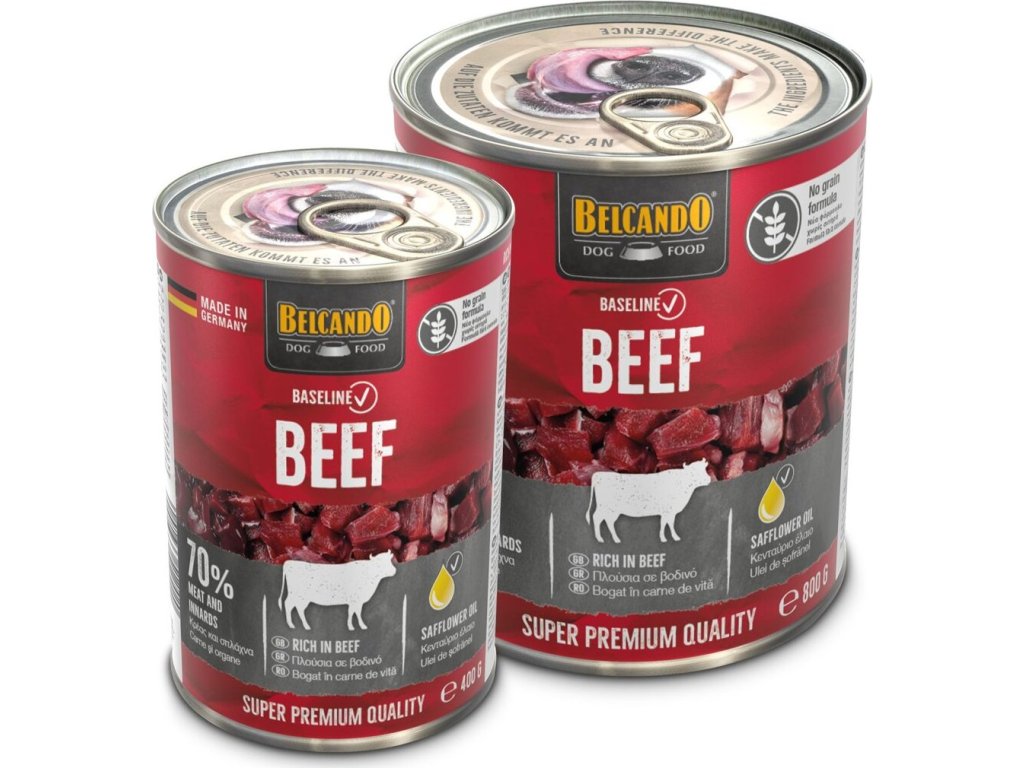 Masové konzervy pro psy s hovězím masem, bez obilovin.