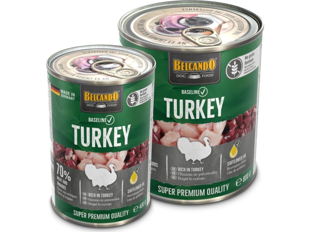 Masové konzervy pro psy s krocaním masem, bez obilovin. Receptura obsahuje 70 % masa a vnitřností. Kompletní krmivo pro psy.