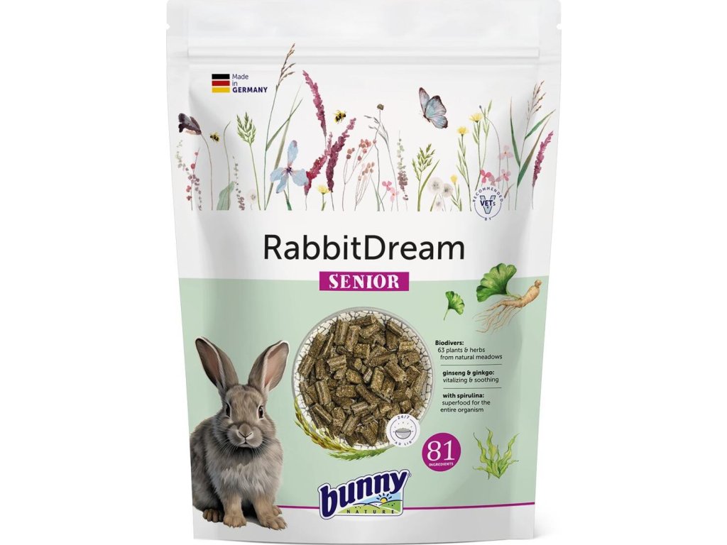 Dopřejte svému králíčkovi to nejlepší a udržujte ho ve skvělé kondici díky správně vyvážené stravě od Bunny Nature. S patentovanými TriMello peletami vyvinutými pro specifické potřeby králíků. Obsahuje superpotraviny spirulinu, ženšen a ginkgo. Řasa spirulina je bohatá na bílkoviny, vitamíny, minerály a antioxidanty. Podporuje imunitu, detoxikaci, zlepšuje trávení a může pomoci zvýšit energii. Ženšen posiluje imunitu, zlepšuje paměť, pomáhá tělu zvládat stres a podporuje celkovou vitalitu. Přezdívá se mu bylina dlouhověkosti. Ginkgo biloba podporuje kognitivní funkce a zvyšuje prokrvení mozku. Je také známé svými antioxidačními účinky a podporou zdraví cév. celkem 81 vybraných ingrediencí obsahuje 63 různých travin a bylin z přirozených luk obohacené o ženšen, ginkgo a spirulinu vyvážený obsah vápníku pro zdravé zuby a kosti tři různé délky vláken pro správné obrušování zubů a zdravou střevní mikroflóru optimální poměr vlákniny a škrobu pomáhá předcházet tloustnutí = ideální složení pro dlouhý a spokojený život vašeho králíčka Složení: travní porosty z trvalých luk (bojínek luční, kostřava luční, kostřava červená, psárka luční, lipnice luční, srha laločnatá, kerblík lesní, máchelka srstnatá, hrachor luční, řebříček obecný, kontryhel, tomka vonná, jetel ladní, jitrocel kopinatý, šalvěj luční, třeslice prostřední, sveřep vzpřímený, zvonek rozkladitý, kmín kořenný, chrpa luční, rožec prameništní, pcháč rolní, sveřep měkký, pampeliška smetánka, metlice trsnatá, tužebník jilmový, hlevík, jahodník obecný, vikev ptačí, rozrazil rezekvítek, škarda dvouletá, svízel syřišťový, ovsíř pýřitý, štírovník růžkatý, přeslička rolní, svízel bílý, kakost, kopretina irkutská, chrastavec rolní, kohoutek luční, kyprej vrbice, rozrazil polní, ovsík vyvýšený, lipnice luční, jitrocel prostřední, krvavec toten, vikev úzkolistá, pomněnka rolní, lomikámen zrnatý, bedrník obecný, mochna plazivá, prvosenka jarní, silenka nicí, krvavec menší, ptačinec trávovitý, kozí brada luční, kopřiva dvoudomá, rozrazil douškolistý, jetel luční, vikev plotní, zběhovec lesní, bršlice kozí noha, sedmikráska chudobka), ovesné otruby, slunečnicový extrahovaný šrot, mrkvové výlisky, pšeničné otruby, lněný extrahovaný šrot, pšeničné klíčky, řepkový extrahovaný šrot, pivovarské mláto, lněné semínko, pivovarské kvasnice, sušená spirulina (1 %), lignocelulóza, čekankový inulin (0,6 %), semena ostropestřce mariánského, sušený heřmánek, sušené listy ginkgo biloba (0,1 %), rozmarýn, sušený kořen ženšenu (0,05 %) Nutriční doplňkové látky: vitamín A 11500 IU, vitamín D3 800 IU, vitamín E 69 mg, měď (jako síran mědnatý) 6,9 mg, jód (jako jodičnan vápenatý bezvodý) 1 mg, zinek (jako oxid zinečnatý) 69 mg, mangan (jako oxid manganatý) 46 mg, selen (jako seleničitan sodný) 0,21 mg Analýza: hrubé bílkoviny 14 %, hrubé oleje a tuky 3,3 %, hrubá vláknina 19,5 %, škrob 6 %, hrubý popel 8,5 %, vápník 0,7 %, fosfor 0,4 %, sodík 0,18 % Poměr hrubé vlákniny a škrobu - 3,3 : 1 Doporučené dávkování: Naplňte misku krmivem Bunny Nature a počkejte, až zvíře krmivo spotřebuje. Poté doplňte. Dbejte, aby měl králík vždy k dispozici zároveň kvalitní seno a čerstvou vodu. Ve věku šesti měsíců přejděte na recepturu pro dospělé králíky. Krmiva Bunny Nature jsou balena v recyklovatelném uzavíratelném sáčku pro zachování čerstvosti. Patentované TriMello pelety Díky speciálnímu způsobu výroby jsou obsažené byliny zpracovány v různé délce a tloušťce vláken. Proč? Zatímco neustále dorůstající řezáky a stoličky potřebují drsnou vláknitou strukturu pro řádné obrušování, jemné částice jsou důležité pro slepé střevo, které slouží jako fermentační komora. Specifická délka vláken je potřeba i pro zdravé zažívání. Tvar pelet je přizpůsoben specifickému druhu zvířete, pro které je krmivo určeno – zatímco králíci žvýkají do tvaru osmičky, morčata, osmáci a činčily hýbají čelistí dopředu-dozadu. Země původu: Německo
