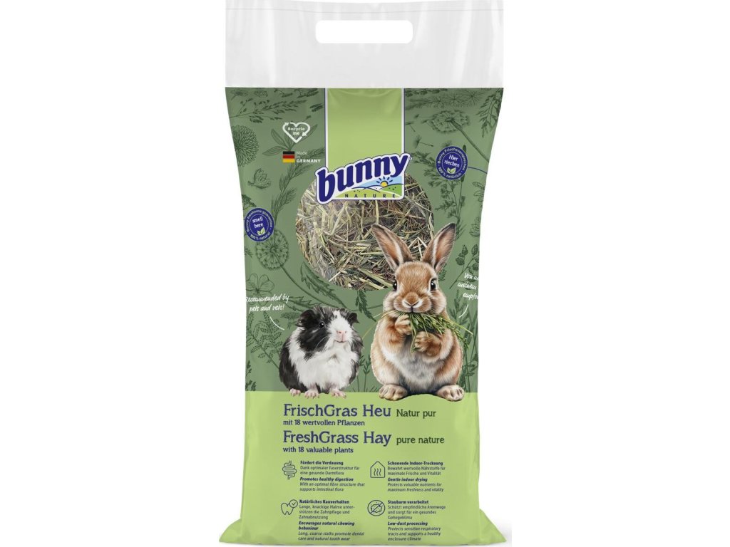 Seno je nezbytnou součástí potravy doma chovaných zakrslých králíků, morčat a dalších hlodavců. Tvoří podstatnou část jejich jídelníčku a jeho kvalita je tedy opravdu důležitá. Seno Bunny FreshGrass zaručuje nejvyšší kvalitu a maximální pestrost obsažených rostlin. Díky tomu obsahuje dostatek živin a hlavně skvěle chutná! – obsahuje 18 druhů travin – přirozeně pestré složení obsažených travin – šetrně sušeno pod střechou teplým vzduchem – křupavé a bezprašné – bohaté na přirozené živiny a vlákninu Složení: bojínek luční, kostřava luční, psárka luční, jílek, kostřava červená, lipnice luční, psineček výběžkatý, srha, jílek vytrvalý, smetanka lékařská, mochna husí, ptačinec prostřední, řebříček obecný, jitrocel kopinatý, jetel plazivý, jetel luční, štírovník růžkatý Kromě rozmanitosti travin je důležitým měřítkem kvality sena také jeho samotné zpracování a struktura vláken. Seno Bunny FreshGrass je šetrně sušeno pod střechou teplým vzduchem a pečlivě baleno. Díky tomu nejsou jeho stébla porušena a zůstává tak křupavé a bezprašné. Křupavá stébla a optimální obsah vlákniny jsou nezbytná pro správné obrušování zubů a zdravý zažívací trakt. Analýza: hrubé bílkoviny 12 %, hrubá vláknina 23 % Země původu: Německo