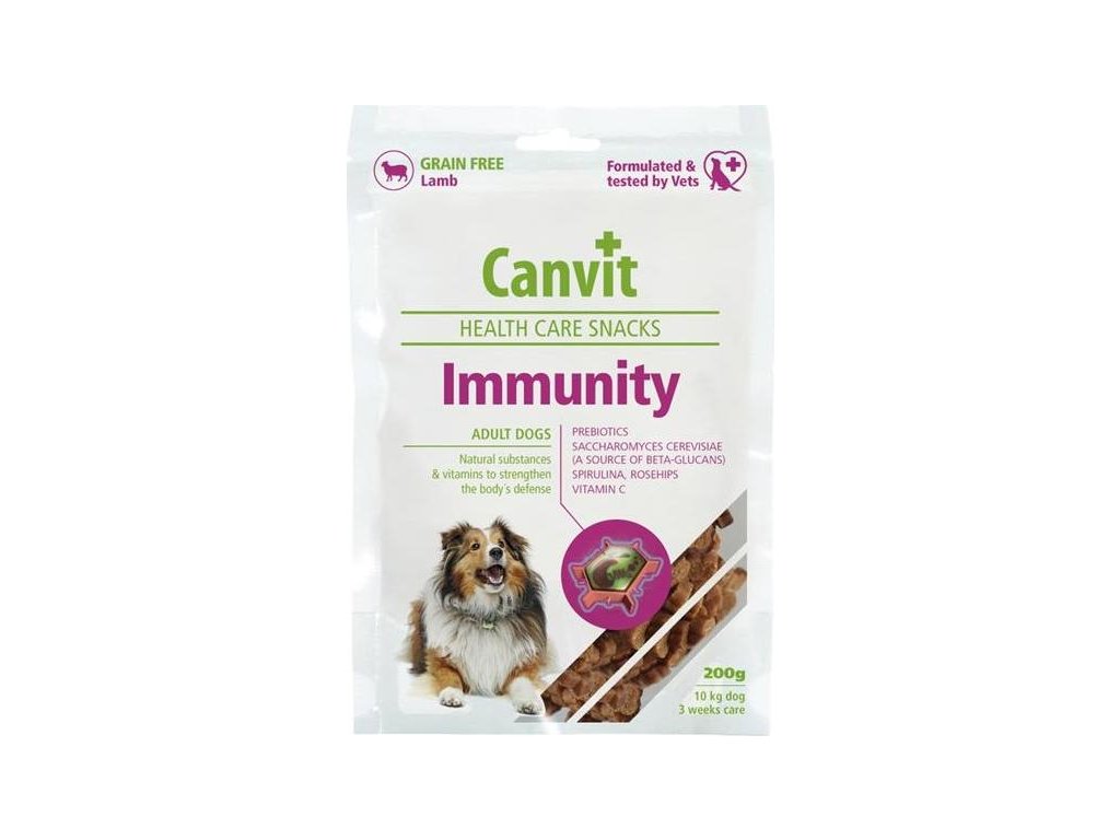 Funkční pochoutky pro psy s jehněčím masem pro rychlé nastartování imunity a urychlení rekonvalescence a regenerace v období nemoci, po úrazech i operacích.Masové pamlsky Canvit Immunity jsou určené pro každodenní podávání u štěňat, dospělých psů i seniorů v náročných a stresových období života: