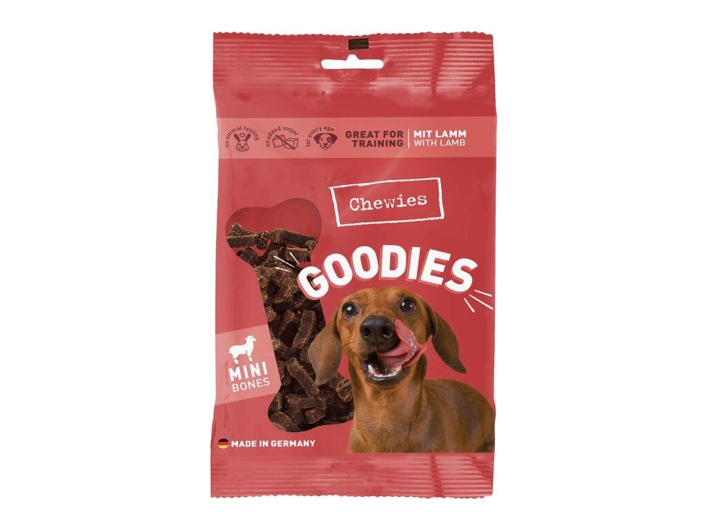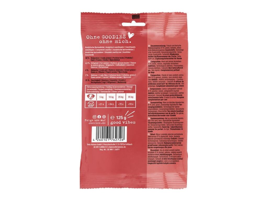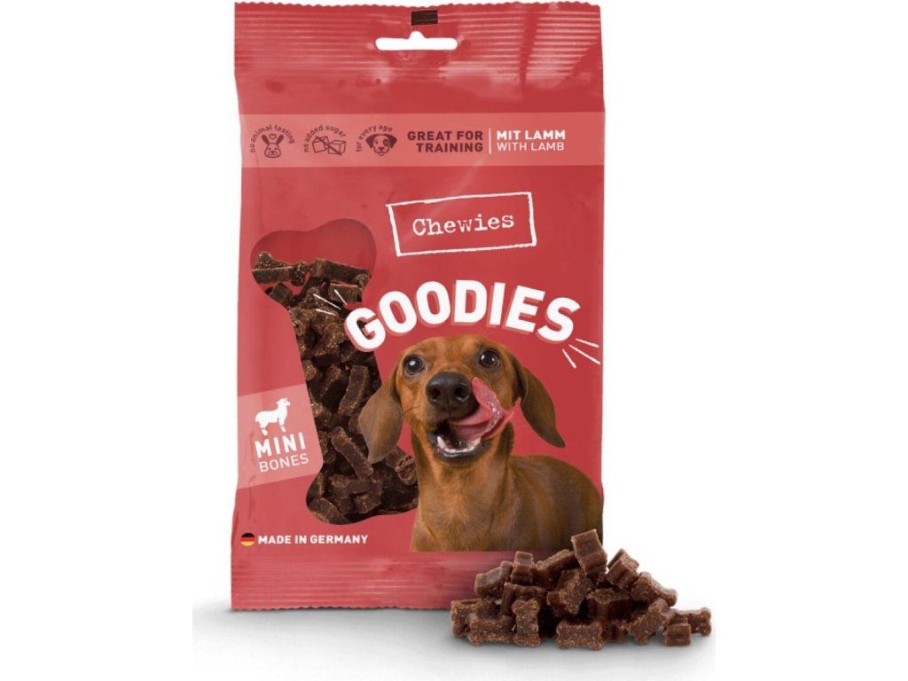 Poloměkké kostičky pro psy, ideální pro výcvik nebo jako chutná malá odměna. Tyto pamlsky byly vyvinuty ve spolupráci se psími školami a cvičiteli. Velikost kostičky je cca 1 cm a jsou proto vhodné i pro ta nejmenší plemena psů. Kostičky neobsahují cukr. Složení: maso a živočišné vedlejší produkty (jehněčí 5 %), obiloviny, vedlejší rostlinné produkty Analýza: hrubé bílkoviny 30 %, hrubé oleje a tuky 6,5 %, hrubá vláknina 2 %, hrubé popeloviny 6 %, vlhkost 25 % Doplňkové látky: konzervační látky, barviva Chewies jsou vyrobené v Německu. Podávejte jako odměnu. Zajistěte dostatek pitné vody. Určeno pro psy.