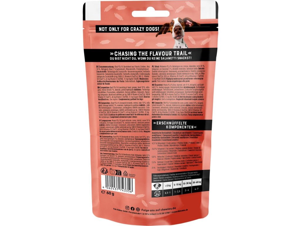 Salametti jsou měkké pamlsky s intenzivní chutí a vůní opravdového salámu, kterým žádný pes neodolá! Jsou vyrobeny z přírodních surovin, šetrně sušených vzduchem, s vysokým podílem masa (přes 90 %), bez laktózy, obilovin a přidaného cukru. Mají tvar malých salámků a snadno je nalámete na menší kousky, což z nich dělá ideální tréninkový pamlsek a odměnu. Díky vysokému obsahu proteinu a kolagenu jsou perfektní volbou i pro aktivní psy, kterým dodají potřebnou energii, ať na tréninku nebo jen cestách. bez laktózy, obilovin a přidaného cukru s výraznou chutí a vůní salámu – skvělé nejen pro vybíravé psy obsahuje kolagen, který pomáhá udržovat zdravé klouby, srst a kůži baleno v praktickém balení se zipem, které udrží pamlsky měkké a voňavé po delší dobu vyrobeno v Německu Složení: hovězí maso 93,6 % (skládající se z masa, škvarků, srdce 10 % a kolagenu), sýr 2 % (sušený), minerální látky, hydrolyzovaný protein Analýza: hrubé bílkoviny 42,5 %, hrubé oleje a tuky 26,5 %, hrubé popeloviny 5,8 %, hrubá vláknina 1,5 %, vlhkost 23 % Nutriční doplňkové látky na kg: vitamin A 5000 IU (3a672a), vitamin D3 500 IU (3a671), vitamin E 40 mg (3a700i), měď 12 mg (3b405) Technologické a senzorické přídavné látky: Konzervační látky: sorban draselný, dusitan sodný, propionát vápenatý, kyselina propionová, kyselina fosforečná Antioxidanty: tokoferoly (vitamin E) Barviva: oxid železitý Příchutě: salámová příchuť