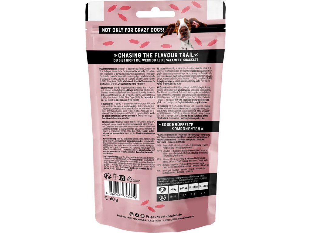 Salametti jsou měkké pamlsky ve tvaru malých salámků s intenzivní masovou chutí a vůní, které si váš mazlíček zamiluje! Jsou šetrně sušené vzduchem a obsahují vysoké množství hovězího masa a srdce (přes 95 %). Nenajdete v nich obiloviny ani přidaný cukr. Snadno se lámou na menší kousky a jsou tak vhodné pro psy všech velikostí a věkových kategorií. Díky vysokému obsahu proteinu jsou perfektní volbou i pro aktivní psy, kterým dodají potřebnou energii na tréninku i na cestách. s kolagenem, který pomáhá udržovat zdravé klouby, srst a kůži bez obilovin a přidaného cukru baleno v praktickém balení se zipem, které udrží pamlsky déle čerstvé a voňavé vybírat můžete z šesti druhů vyrobeno v Německu Složení: hovězí maso 95,6 % (skládající se z masa, škvarků, srdce 10 % a kolagenu), minerální látky, hydrolyzovaný protein Analýza: hrubé bílkoviny 43 %, hrubé oleje a tuky 26,5 %, hrubé popeloviny 5,7 %, hrubá vláknina 1,5 %, vlhkost 23 % Nutriční doplňkové látky na kg: vitamin A 5000 IU (3a672a), vitamin D3 500 IU (3a671), vitamin E 40 mg (3a700i), měď 12 mg (3b405) Technologické a senzorické přídavné látky: Konzervační látky: sorban draselný, dusitan sodný, propionát vápenatý, kyselina propionová, kyselina fosforečná Antioxidanty: tokoferoly (vitamin E) Barviva: oxid železitý Příchutě: salámová příchuť