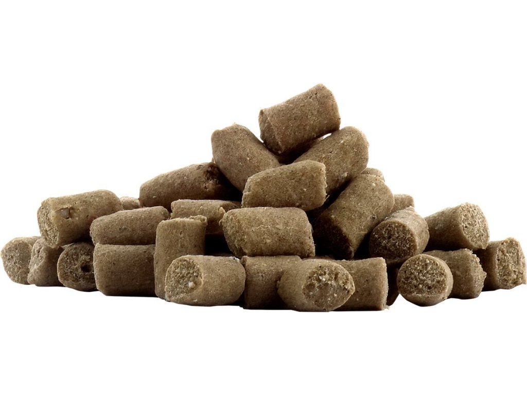 Poloměkké pamlsky s kozím masem jsou 100% přírodní a díky svým drobným rozměrům (cca 1 cm) perfektně hodí například na trénink a pro časté odměňování. Nenajdete v nich žádná umělá dochucovadla, obiloviny ani cukr, jsou snadno stravitelné a vhodné i pro psy s citlivým zažíváním. Kromě kozího masa a vnitřností obsahují brambory, jablko, mrkev, lososový olej a bohatou směs bylinek, která jim dodává neodolatelnou vůni. monoproteinové – vhodné i pro alergické psy bez obilovin, přidaného cukru a umělých dochucovadel s bohatou směsí zdraví prospěšných bylin (máta peprná, kmín, pískavice, lékořice, kurkuma, fenykl a heřmánek) s lososovým olejem – přírodním zdrojem esenciálních aminokyselin v praktickém znovu uzavíratelném obalu vyrobeno v Německu Složení: kozí maso a vnitřnosti 52 %, bramborová moučka, bramborový škrob, brambory, mrkev, jablko, lososový olej, směs sušených bylinek (máta peprná, kmín, pískavice, lékořice, kurkuma, fenykl a heřmánek), řepkový olej, minerální látky Analýza: hrubé proteiny 9,4 %, hrubé oleje a tuky 5,4 %, hrubé popeloviny 3,2 %, hrubá vláknina 1,2 %, vlhkost 22,7 %