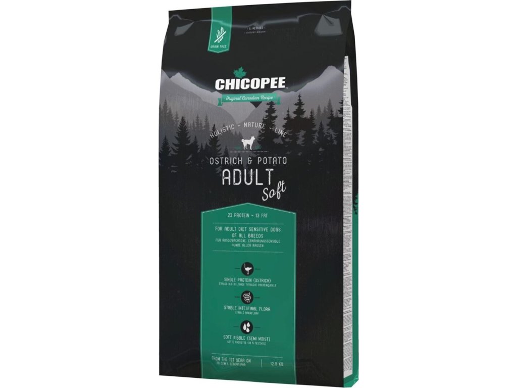 CHICOPEE HOLISTIC SOFT ADULT OSTRICH-POTATO je krmivo pro dospělé psy všech plemen.Měkké granule (18 % vlhkosti) zajišťují v krmivu Adult pštros & brambory speciální chuťový zážitek. Díký redukované receptuře je toto krmivo velmi hodné pro psy citlivé na krmivo.
