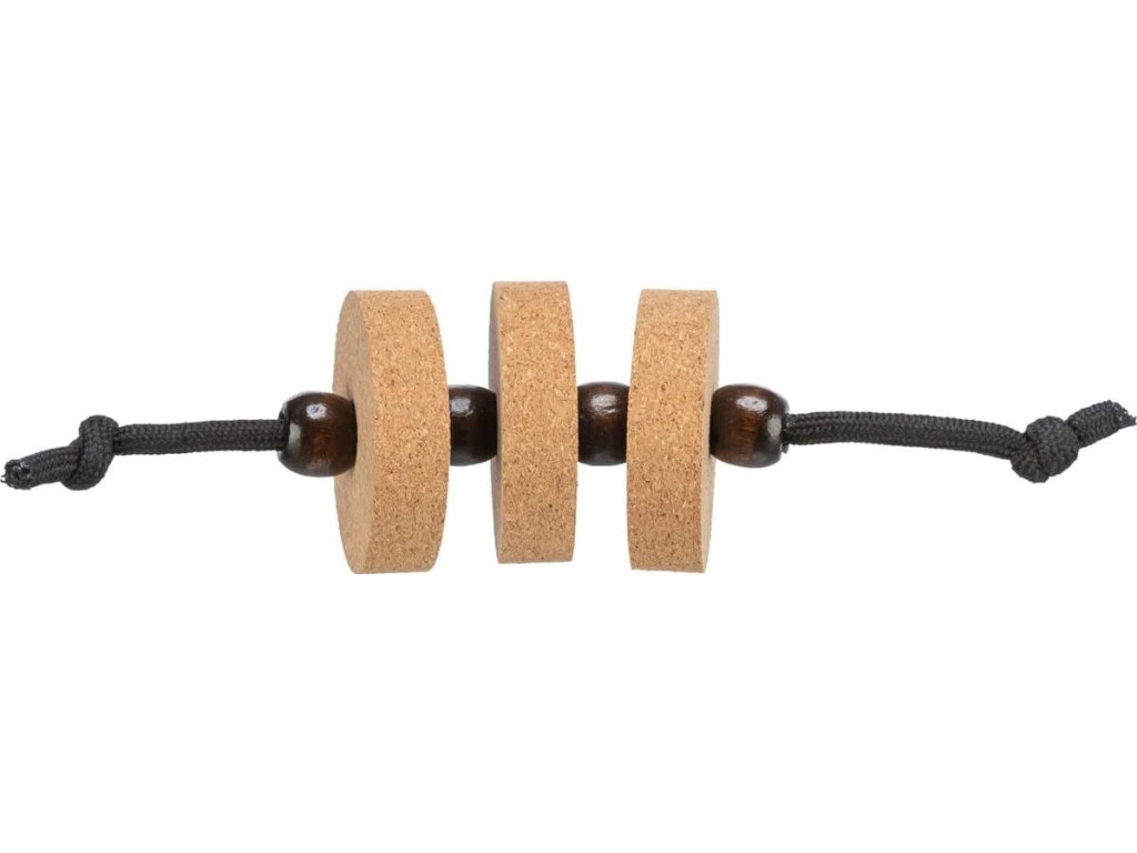 - korková kolečka navlečená na šňůře, zajištěná dřevěnými korálky