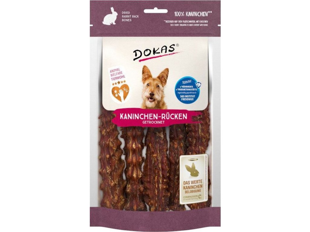 Sušená králičí páteř je 100% přírodní pochoutkou pro psy, jejíž vůně, struktura a vzhled probudí i ve Vašem psovi vlka! Tato pochoutka je určena pro podávání pod dozorem, pro psy, kteří jsou zvyklí jíst kosti. Uspokojuje přirozenou potřebu žvýkat, je bez konzervantů, umělých barviv, dochucovadel a glycerinu a je tak vhodná i pro alergiky. Výroba těchto pamlsků se řídí přísnými předpisy Animal Welfare, které upravují zacházení se zvířaty, stanovují způsob a podmínky jejich chovu a určují pravidla pro zpracování masa s ohledem na životní prostředí i samotná zvířata. Samotný chov králíků se rovněž pyšní oceněním Good Rabbit Award, které je udělováno společnostem, co dodržují pravidla druhově vhodného chovu. Sáček má praktické uzavírání a pamlsky tak zůstanou déle čerstvé a voňavé. Složení: králičí páteř 97%, vedlejší produkty rostlinného původu, minerály Analýza: hrubé bílkoviny 47,9%, hrubé oleje a tuky 15,3%, hrubé popeloviny 20,5%, hrubá vláknina 0,5%, vlhkost 11% Psí a kočičí pamlsky Dokas podléhají pravidelným kontrolám kvality německým institutem SGS Institut Fresenius. Tato nezávislá laboratoř patří mezi přední evropské společnosti testující kvalitu potravin. Pamlsky jsou v dnešní době nedílnou součástí krmení mazlíčků, i u nich je tedy potřeba dbát nejen na chuť, ale i na zdravé složení. U pamlsků Dokas máte jistotu, že všechny použité suroviny splňují přísná kritéria a jsou během výroby pravidelně prověřovány. Ve videu můžete porovnat chov králíků v jiných společnostech a chov v Dokas podle pravidel welfare, dbající na pohodu a zdraví chovaných zvířat.
