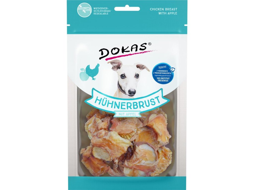 Zdravá kombinace sušených kuřecích prsou a jablek plná živin. Ideální pro milovníky dobrého masa a sušeného ovoce. Vysoká kvalita použitých surovin zaručuje výraznou chuť a vůni. Jsou velmi oblíbené pro své přírodní složení. Pamlsky Dokas jsou bez konzervantů, umělých barviv, dochucovadel a glycerinu. Sáček má praktické uzavírání, pamlsky tak zůstanou déle čerstvé a voňavé. Složení: filet z kuřecích prsou 57%, jablko 35%, vedlejší rostlinné produkty, minerální látky Analýza: hrubé bílkoviny 37%, hrubé oleje a tuky 3,4%, hrubé popeloviny 3,2%, hrubá vláknina 2,2%, vlhkost 15,8% Podávejte jako odměnu. Zajistěte dostatek pitné vody. Po otevření pečlivě uzavřete zipem a skladujte v suchu a chladu. Balení obsahuje kyslíkový absorbér pro uchování kvality výrobku. Pamlsky jsou v dnešní době nedílnou součástí krmení mazlíčků, a tak i u nich je potřeba dbát nejen na chuť, ale i na zdravé složení. U pamlsků Dokas máte jistotu, že všechny použité suroviny splňují přísná kritéria a jsou během výroby pravidelně prověřovány. Psí a kočičí pamlsky Dokas podléhají pravidelným kontrolám kvality světově uznávaným německým institutem SGS Institut Fresenius. Tato nezávislá laboratoř patří mezi přední evropské společnosti testující kvalitu potravin. Jaké suroviny najdete ve složení pamlsků Dokas? Maso Maso je jednou z hlavních složek psí a kočičí potravy. Z toho důvodu tvoří největší podíl také v našich pamlscích. Je pečlivě vybíráno a šetrně zpracováno tak, aby výsledný produkt obsahoval vysoce kvalitní bílkoviny a tuky. Ryby Ryby jsou výbornou alternativou k masovým pamlskům. Obsahují vysoké procento nenasycených mastných kyselin. Omega 3 mastné kyseliny pomáhají udržovat zdravou kůži a lesklou srst. Ovoce a zelenina Vitamíny a stopové prvky v ovoci a zelenině jsou zdravé nejen pro lidi, ale také pro naše čtyřnohé přátele. Rádi kombinujeme maso a ryby s vybranými lehce stravitelnými druhy, jako je jablko, banán, mango, mrkev a batát. Hovězí a vepřová kůže Kosti vyrobené hovězí a vepřové kůže pomáhají pečovat o zuby vašeho psa a také jej umí perfektně zabavit. Kombinujeme je s masem či rybí kůží, což zvyšuje jejich oblíbenost. Díky těmto žvýkacím pamlskům nebude mít váš pes potřebu kousat vaše boty či zařízení bytu. Sůl Psi potřebují sůl zejména pro tvorbu kyseliny chlorovodíkové v jejich žaludku a k udržení správné funkce nervové soustavy. Její nadbytek však není žádoucí, proto přidáváme do našich pamlsků pouze malé množství, méně jak 0,3%. Kvasnice Kvasnice obsahují vysoký obsah proteinu, vitamínů a minerálů. Pomáhají udržovat zdravou kůži a srst. Rostlinné produkty Získáváme je při zpracování rostlinných surovin, například zeleniny a luštěnin. Nepoužíváme žádné odpady z rostlinné výroby a plnidla. Minerální látky Minerální látky jsou nezbytnou součástí výživy psa, jehož organismus si je nedokáže sám vyrobit. Používáme pouze malé množství soli (méně než 0,3%).