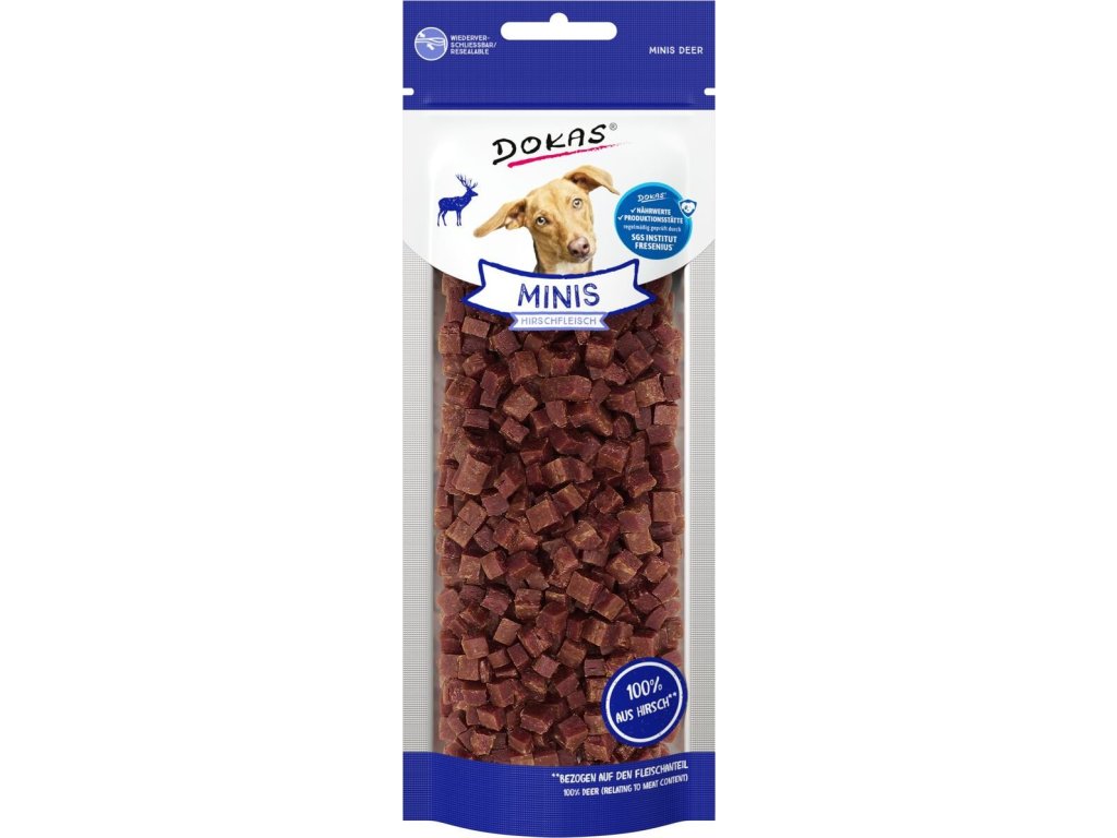 Mini kostičky z jeleního masa se skvěle hodí na trénink nebo pro odměňování při fyzicky náročných aktivitách, kdy je důležité psovi dodávat energii ale nepřekrmovat ho. Snadno je schováte do různých hraček a čmuchacích koberečků a díky svým drobným rozměrům jsou vhodné i pro ty nejmenší chlupáče. Kostičky obsahují L-karnitin, který pomáhá tělu spalovat tuky tím, že je přeměňuje na energii. Hodí se tak i pro chlupáče, co si udržují svou váhu! Obsažené fruktooligosacharidy (FOS) fungují jako probiotika. Podporují růst prospěšných bakterií ve střevech a přispívají k lepšímu trávení a celkovému zdraví střevní mikroflóry. Složení: jelení maso 93 %, vedlejší rostlinné produkty, fruktooligosacharidy, minerály Nutriční doplňkové látky na kg: L-karnitin 300 mg Analýza: hrubé bílkoviny 41 %, hrubé oleje a tuky 5 %, hrubé popeloviny 3,7 %, hrubá vláknina 0,5 %, vlhkost 25 % S Dokas máte jistotu, že váš pes dostává jen to nejlepší. Pamlsky Dokas jsou bez konzervantů, umělých barviv, dochucovadel a přidaného cukru a jejich výroba podléhá pravidelným kontrolám kvality, které provádí celosvětově uznávaný institut SGS Institut Fresenius – nezávislá německá laboratoř testující kvalitu potravin. Pamlsky jsou baleny v sáčku s praktickým znovu uzavíratelným zipem, což zaručuje, že zůstanou déle čerstvé a voňavé. Pro zachování kvality balení rovněž obsahuje kyslíkový absorbér. Podávejte jako odměnu. Zajistěte dostatek pitné vody.