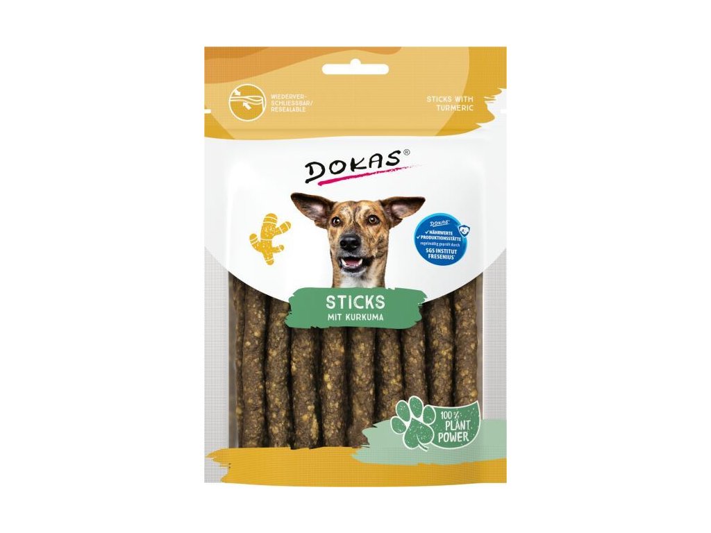 Poloměkké tyčinky vyrobené z rostlinných bílkovinných extraktů, ovoce a zeleniny jsou 100% přírodní bezmasé pamlsky, které můžete podávat vcelku jako měkký žvýkací pamlsek nebo je snadno nalámat na menší kousky a využít je jako odměnu, například při tréninku. Neobsahují umělé konzervanty, dochucovadla a barviva. Jedinečná kvalita použitých surovin zaručuje jejich výraznou chuť a přirozenou vůni, které si váš mazlíček zamiluje! Kurkuma působí jako silný antioxidant s protizánětlivými účinky, který u psů pomáhá udržovat a zlepšovat zdraví kloubů a podporuje správnou funkci střev. Pivovarské kvasnice poskytují psům bohatý zdroj vitamínů skupiny B, které přispívají k zdravé srsti, kůži, posílení imunity a celkové vitalitě. Složení: rostlinné bílkovinné extrakty, banán, rostlinný surový glycerin (řepkový), řepkový olej, pivovarské kvasnice, kurkuma 2 %, jablečné výlisky, cizrna, minerální látky Analýza: hrubý protein 44,8 %, hrubá vláknina 0,8 %, hrubé oleje a tuky 6,9 %, hrubé popeloviny 2,3 %, vlhkost 14 % Tyto pamlsky představují ideální volbu pro psy s alergiemi na živočišné bílkoviny a pro všechny, kteří preferují ekologicky šetrný a vegetariánský životní styl. Znovu uzavíratelný obal zajišťuje, že pamlsky zůstanou čerstvé a voňavé po dlouhou dobu. Psí a kočičí pamlsky Dokas podléhají pravidelným kontrolám kvality světově uznávaným německým institutem SGS Institut Fresenius – nezávislá laboratoř patřící mezi přední evropské společnosti testující kvalitu potravin. Podávejte jako odměnu. Zajistěte dostatek pitné vody. Po otevření pečlivě uzavřete zipem a skladujte v suchu a chladu. Balení obsahuje kyslíkový absorbér pro uchování kvality výrobku.