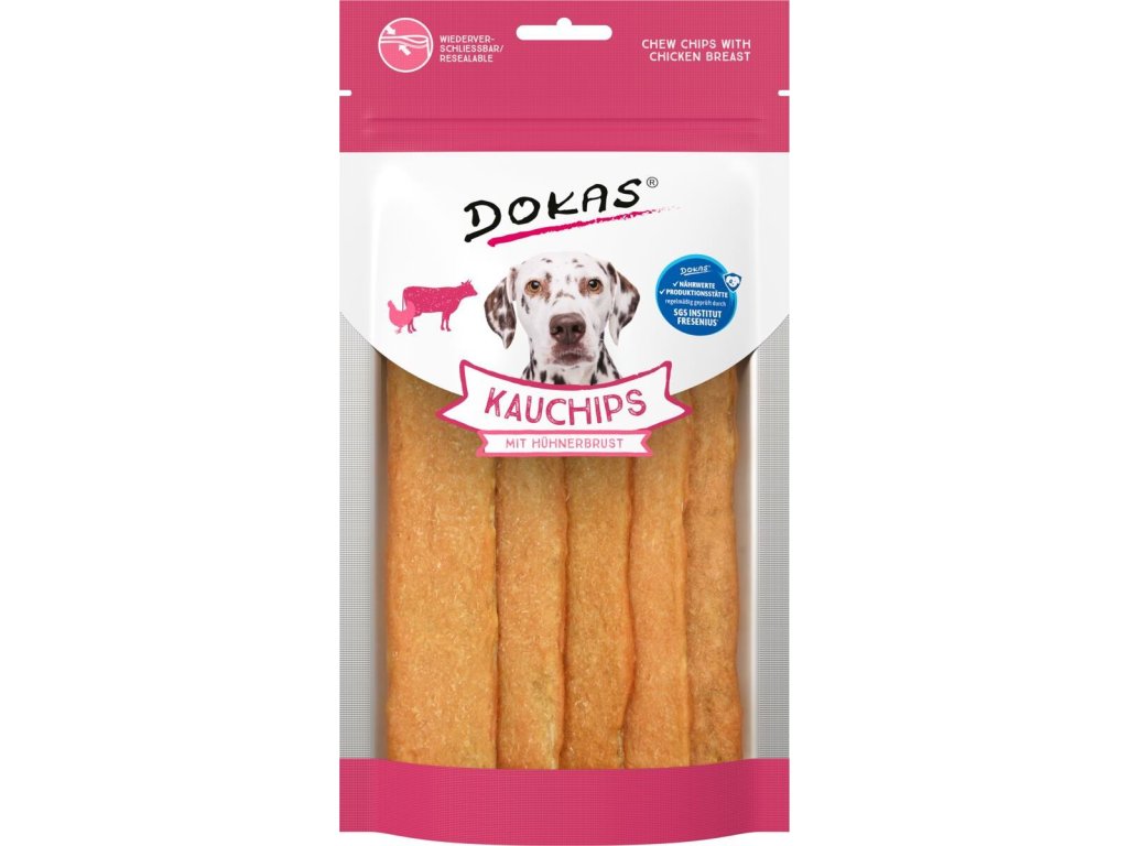 Neodolatelná kombinace hovězí kůže, kuřecích prsíček a kolagenu ve formě žvýkacích plátků. Přírodní pamlsky pro psy, které pečují o zdraví kloubů a silné čelistní svaly. Stejně jako všechny pamlsky Dokas jsou 100% přírodní, bez konzervantů, dochucovadel, barviv, či glycerinu. Kolagen pomáhá udržovat klouby pružné a podporuje jejich správné fungování. To je klíčové zejména pro psy ve vyšším věku a psí sportovce. Balení obsahuje kyslíkový absorbér pro maximální uchování kvality výrobku a díky praktickému zipu lze sáček opětovně uzavřít. Složení: hovězí kůže 62 %, kuřecí prsní řízky 20 %, vedlejší rostlinné produkty, hovězí kolagen, minerální látky Analýza: hrubé bílkoviny 67 %, hrubé oleje a tuky 2,4 %, hrubé popeloviny 3,2 %, hrubá vláknina 0,5 % vlhkost 15,8 % Výroba pamlsků Dokas se řídí přísnými normami a podléhá pravidelným kontrolám kvality prováděným světově uznávaným institutem SGS Fresenius, což zaručuje 100% bezpečnost a kvalitu výrobku.