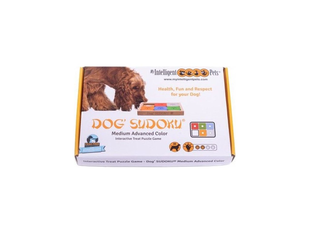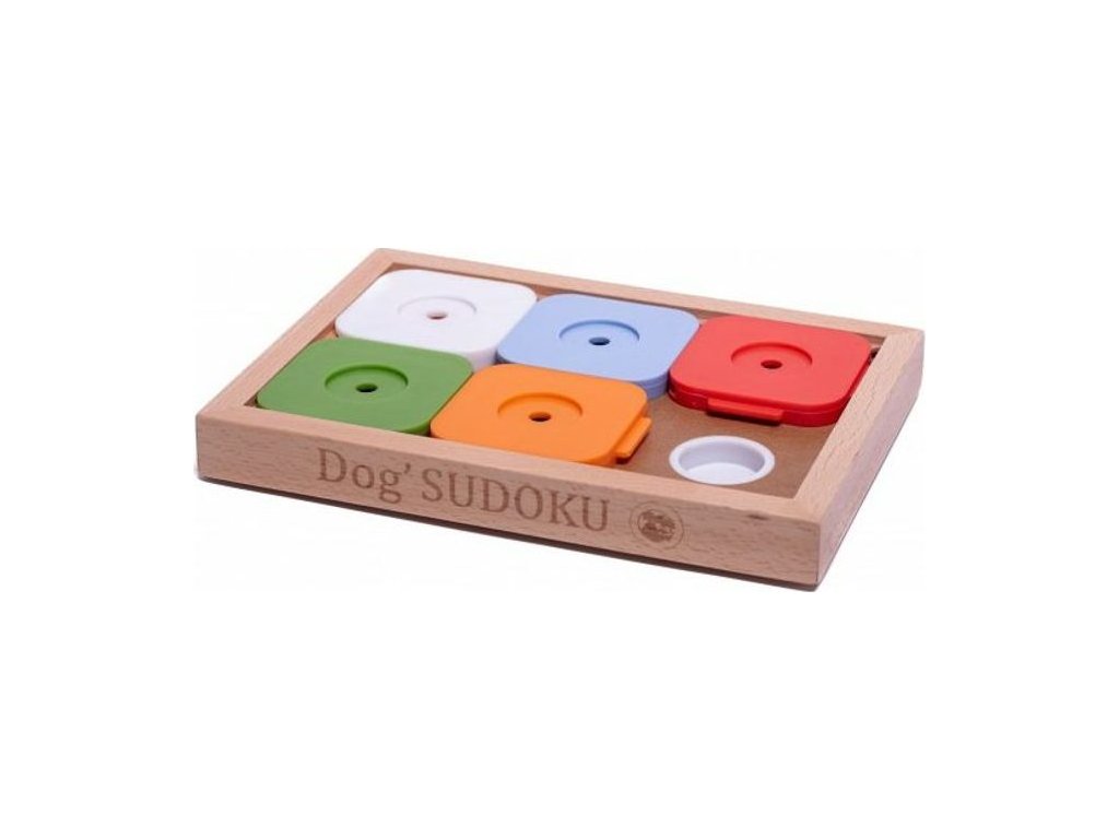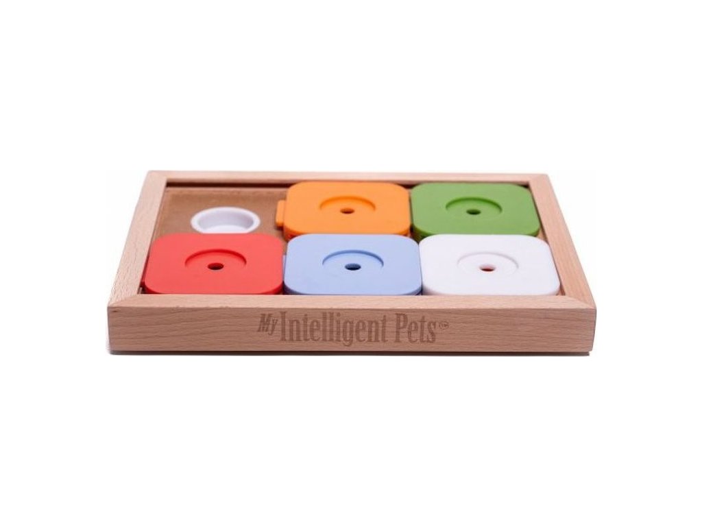Hlavolam pro psy Dog Sudoku Advanced Color od rakouské značky My Intelligent Dogs je inovativní interaktivní hračka pro psy, která vám pomůže vašeho pejska zabavit zcela novým způsobem. Tato verze Sudoku má střední stupeň obtížnosti a je určena pro psy, kteří už mají s řešením hlavolamů určitou zkušenost. Na obdélníkové hrací desce je 6 úkrytů, které jsou zakryty 5 posuvnými destičkami. Do každého úkrytu schováte před začátkem hry pejskovi nějakou dobrotu a jeho úkolem je destičky posouvat pomocí tlapek nebo čumáku. Jedině tak se dostane k ukrytým pamlskům. V každé posuvné destičce je otvor, díky kterému má pejsek možnost dobrotu rychle ucítit, což zvyšuje jeho motivaci ke hře s hlavolamem. Mrkněte na video níže, jak hlavolam správně připravit. Pejsci si na něm osvojí nové dovednosti a především je zábavnou formou přimějete ke zklidnění a přemýšlení. Při hledání ukrytých dobrůtek zapojí hlavně čich, svůj nejpřirozenější a nejrozvinutější smysl. Nalezené dobroty poslouží jako motivace a posléze jako odměna.