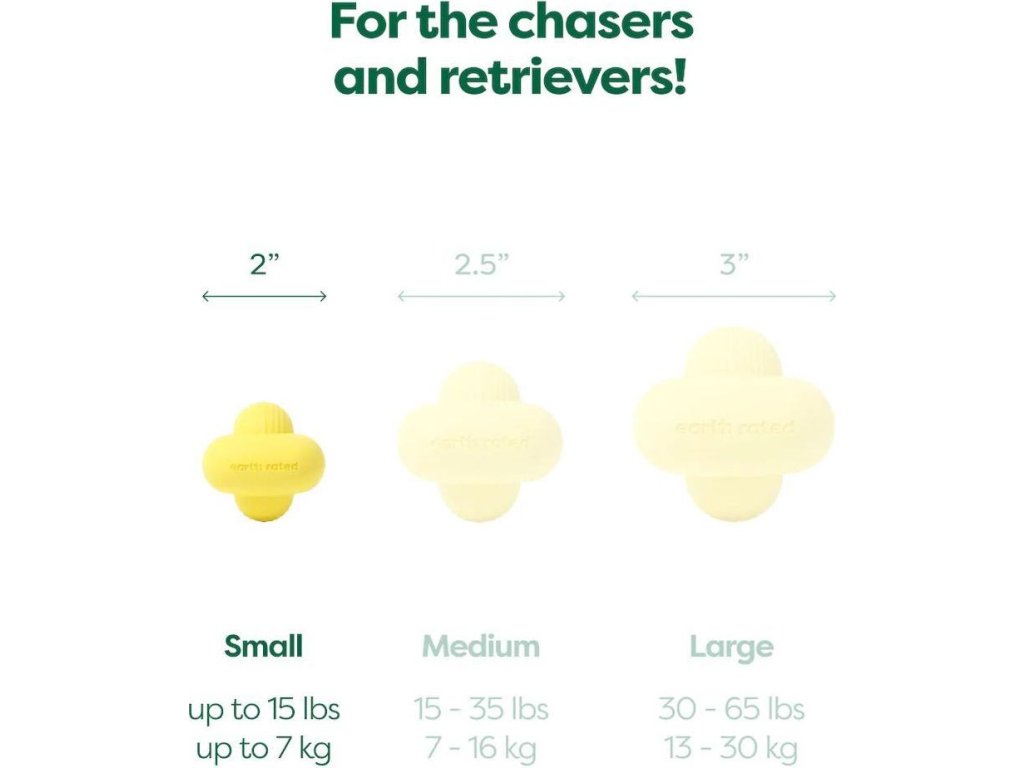 Jako míček, jen o něco lepší – tato hračka od Earth Rated nabízí nový zábavný způsob, jak si užít aportování s vaším psem. Plave na vodě a při dopadu na zem nepředvídatelně skáče do všech stran, čímž stimuluje lovecký instinkt psa a vybízí ho k rychlým reakcím. Tvar hračky zároveň umožňuje proudění vzduchu při držení v psí tlamě, což oceníte hlavně v létě nebo při delší hře, kdy je ochlazování psa tolik důležité. Vroubky na povrchu napomáhají k pohodlnému držení hračky v psí tlamě, tlapkách i lidských rukou. Díky žluté barvě pes tuto hračku velmi dobře vidí a rozpozná v trávě i na vodě. Je tomu tak proto, že psi vnímají škálu barev především ve žlutých, modrých a šedých odstínech, což způsobuje, že žluté předměty vidí výrazněji a snadno přitahují jejich pozornost. plave na vodě s nepředvídatelným odskokem pro maximální zábavu při aportování žlutá barva zajistí, že pejsek hračku zřetelně vidí a rozpozná v trávě i na vodě snadno se čistí a udržuje – vhodné i do myčky nádobí vyrobeno z bezpečného a ekologického přírodního kaučuku s certifikací PEFC (celosvětově nejrozšířenější systém certifikace lesů, který usiluje o udržitelné hospodářství s přírodními zdroji) Společná hra podporuje vzájemnou důvěru a zdravý vztah mezi vámi a vaším mazlíčkem. S Earth Rated si můžete být jisti, že svému psovi nabízíte pouze vysoce kvalitní, odolné a zdravotně nezávadné hračky, se kterými si užijete spoustu zábavy! Velikost S: 5,1 cm Při výběru hračky pro vašeho psa prosím zohledněte jeho velikost a hmotnost. Pokud si nejste jisti, jakou velikost vybrat, doporučujeme zvolit tu větší. Pro snadnější rozhodování mrkněte do galerie produktu, kde najdete i velikostní tabulku a doporučení výrobce. Všechny hračky Earth Rated prošly nezávislými testy zaměřenými na jejich výdrž a odolnost vůči okusování a přetahování. Nezapomeňte ale, že žádná hračka pro psy není nezničitelná, a proto vám doporučujeme na hru neustále dohlížet a v případě, že hračka vykazuje známky poškození, ji psovi odebrat. Pokud se domníváte, že pes spolkl kus hračky, zavolejte svého veterinárního lékaře. Určeno pouze pro psy.