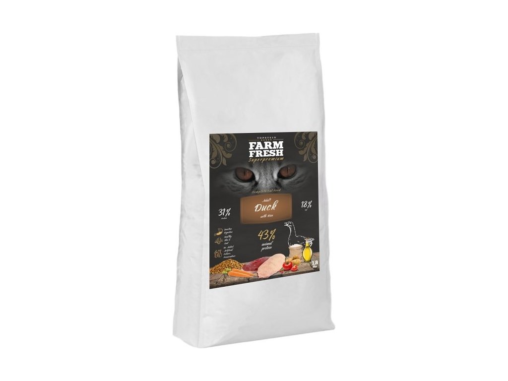 Krmivo vyráběné ve Velké Británii, z lokálních surovin té nejvyšší kvality, představuje vyvážený zdroj veškerých živin pro kočky. Granule Farm Fresh jsou vyráběné nejmodernější technologií s použitím systému vacuum coating. To zabezpečuje rovnoměrné rozptýlení tuků, vitamínů a minerálních látek po celém obsahu granulí. Díky tomu nedochází k rychlé oxidaci tuků, což garantuje dlouhou dobu trvanlivosti krmiva. Jediným zdrojem kvalitní živočišné bílkoviny je maso z kachny obsahující účinné látky, které poskytují kompletní a vyváženou stravu kočky. Granule jsou obohacené o taurin, esenciální aminokyselinu, která hraje klíčovou roli pro zdraví srdce a podporuje funkci očí.