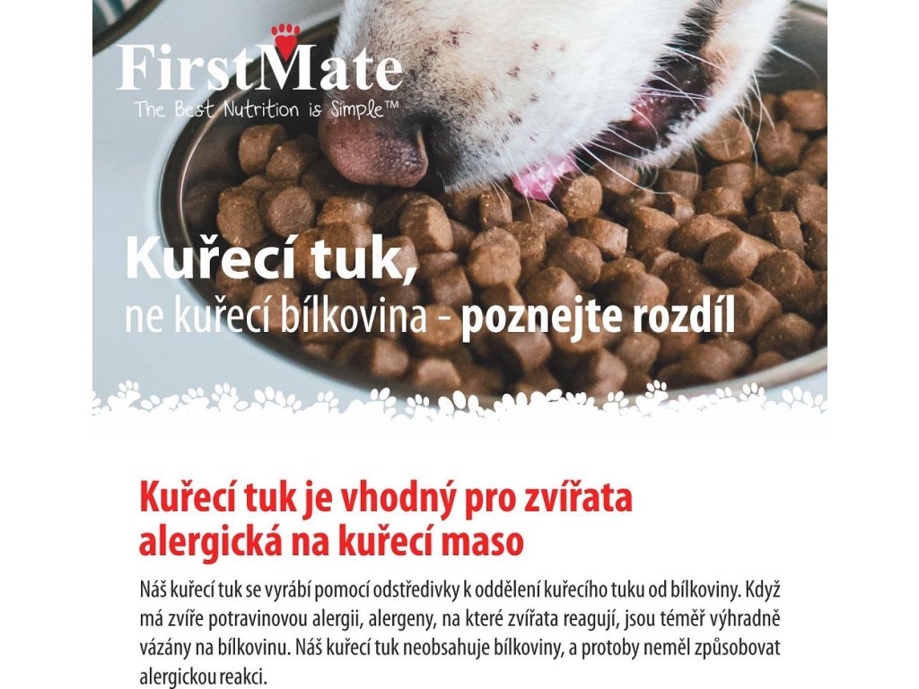 Kuřecí - Kuřecí maso je velmi bohaté na živočišné bílkoviny, které jsou nezbytné pro tvorbu a opravu svalové hmoty a kostí a k tvorbě potřebných hormonů a enzymů. Kuřecí maso je nízkotučné, což znamená, že může být snadno stravitelné a pomáhá udržovat zdravou hmotnost. Kuřecí maso obsahuje mnoho důležitých vitamínů a minerálů, jako jsou například vitamíny B3 a B6, vitamín D, železo a zinek. Kuřecí maso dále obsahuje vysoké množství kyseliny linolové, která pomáhá udržovat zdravou kůži srst u psa. Kuřecí maso také obsahuje aminokyselinu arginin, která podporuje imunitní systém a chrání ho před různými infekcemi.