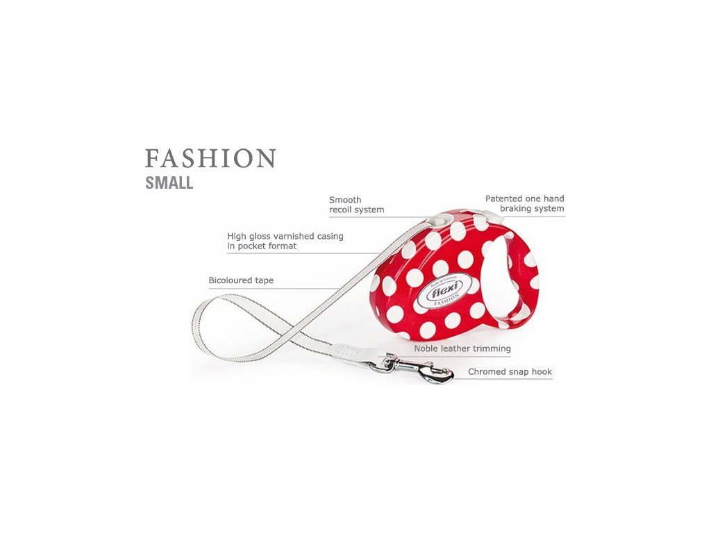 FASHION LADIES je luxusní řada samonavíjecích vodítek značky FLEXI. Tuto kolekci nabízíme v sedmi atraktivních variantách: tečky červené+bílé, kytičky, leopardí motiv, kašmír, růžové káro, hvězdičky modré + červené, barevné pruhy