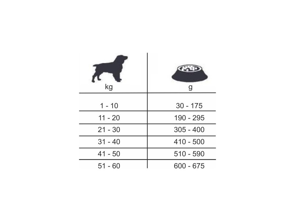 Doporučené denní dávkování viz. tabulka v galerii produktu. Vždy zajistěte, aby měl pes k dispozici dostatek čerstvé vody. Datum minimální trvanlivosti a číslo šarže jsou uvedeny na obalu. Skladujte při pokojové teplotě.