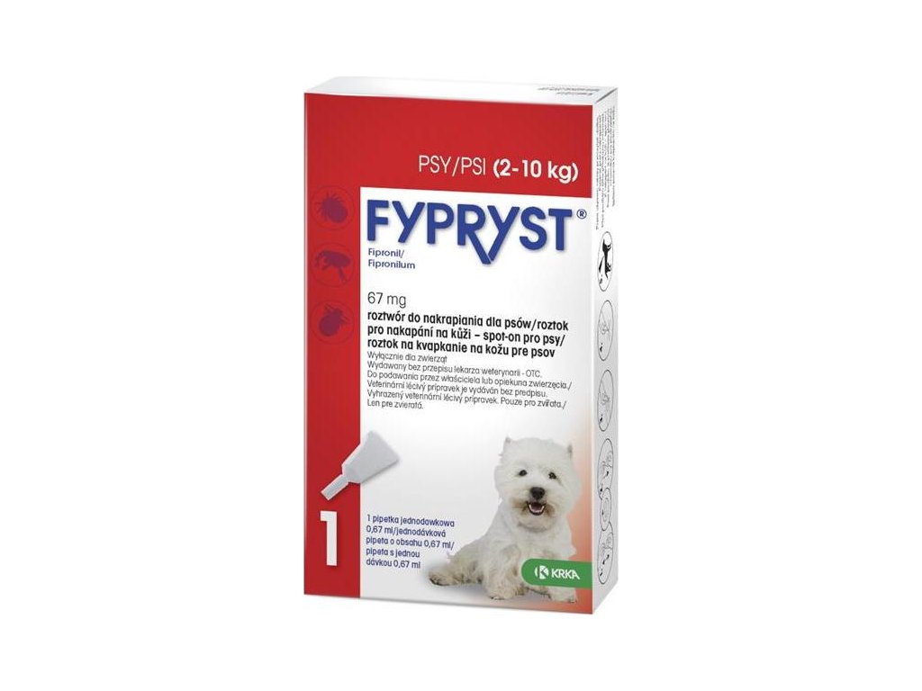 Dávkování a způsob podání: Dávkování Fypryst 67 mg spot-on pro psy - Jedna jednodávková pipeta o obsahu 0,67 ml roztoku pro nakapání na kůži - spot-on pro psa vážícího od 2 kg až do 10 kg živé hmotnosti. Takto zajistíte minimální doporučenou dávku fipronilu 6,7 mg / kg. Vzhledem k absenci studií týkajících se bezpečnosti přípravku je minimální léčebný interval 4 týdny. Měsíční léčba se doporučuje v případě vysokého rizika opakovaného napadení blechami, pokud je pes alergický na bleší kousnutí, v případě nutnosti kontroly napadení klíšťaty nebo při častém koupání psa za použití hypoalergenních nebo zvláčňujících šamponů. V oblastech, kde nehrozí vážné napadení blechami a klíšťaty, může být přípravek Fypryst spot-on aplikován každé dva až tři měsíce.