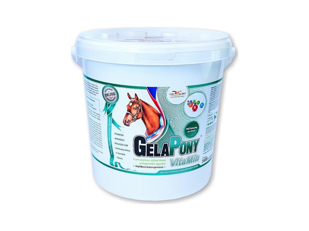 GelaPony VitaMín je doplňkové krmivo pro koně v zájmovém chovu, dostihové a sportovní. Představuje komplexní vitamíno-minerální doplněk s bioaktivními kolagenními peptidy. Je vhodný pro denní doplňování vitamínů a minerálních látek do krmné dávky koní. Současně zajišťuje příjem bioaktivních kolagenních peptidů pro preventivní výživu pohybového aparátu.