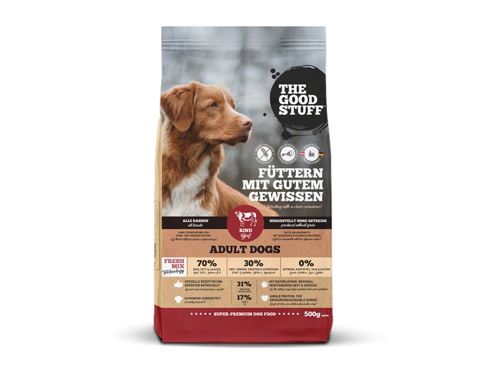 The Goodstuff Adult Beef je revoluční superprémiové kompletní krmivo pro dospělé psy všech plemen a velikostí. Granule jsou vyrobeny novou FRESH-MIX metodou bez obilí, jsou bohaté na čerstvé hovězí maso v potravinářské kvalitě, amarant s nízkým glykemickým indexem, lokální ovoce a zeleninu a vybrané byliny. Výjimečná receptura ve spojení s novou, unikátní, obzvláště šetrnou metodou výroby přinese vašemu psovi mimořádný zážitek plný přírodní chuti!