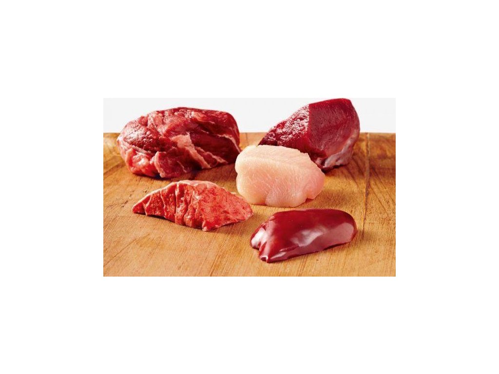 Složení: 38 % hovězí maso (plíce, maso, srdce, játra, ledviny, vemeno), 30 % kuřecí (maso, játra, žaludek, krku), uhličitan vápenatý,