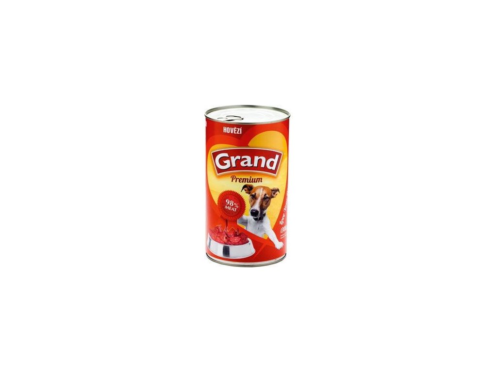 Konzerva GRAND konz. pes hovězí je kompletní krmivo pro psy, vytvořeno z čerstvého masa (min. 60%) bez chemických přísad. Neobsahuje žádné chemické a konzervační přísady ani sóju. Obsahuje podíl vitaminů a aminokyselin v přírodní nepozměněné formě. Do konzerv je přidávána rýžová mouka v maximální míře 0-2 % z důvodu zahuštění masové složky.