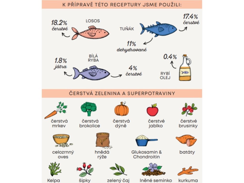 Složení: čerstvý losos 18,2 %, čerstvý tuňák 17,4 %, celý zelený hrášek, dehydrovaný tuňák 11 %, bramborový protein, rýžový protein, celozrnný ječmen 4,4 %, čerstvé bílé ryby 4 %, jablečná vláknina, celozrnný oves 3,5 %, rybí hydrolyzát 1,8 %, dehydrované sladké brambory, lněné semínko (přírodní zdroj mastných kyselin ω3) 1,5 %, hráškový protein, řepné řízky, celozrnná rýže 0,5 %, kvasnice (Saccharomyces cerevisiae), rybí olej (chráněno přírodními tokoferoly) 0,4 %, minerální látky, čerstvá brokolice 1000 mg/kg, čerstvá dýně 1000 mg/kg, čerstvá mrkev 1000 mg/kg, čerstvá jablka 1000 mg/kg, hydrolyzovaná buněčná stěna kvasnic (zdroj MOS) 1000 mg/kg, čekanka (zdroj FOS) 1000 mg/kg, glukosamin 500 mg/kg, výtažek z mandarinky 500 mg/kg, chondroitin 300 mg/kg, Yucca schidigera 200 mg/kg, Řasa Kelpa 30 mg/kg, klikva celé plody 30 mg/kg, šípky (bohaté na vitamín C) 30 mg/kg, zelený čaj 30 mg/kg, kurkuma 30 mg/kg.