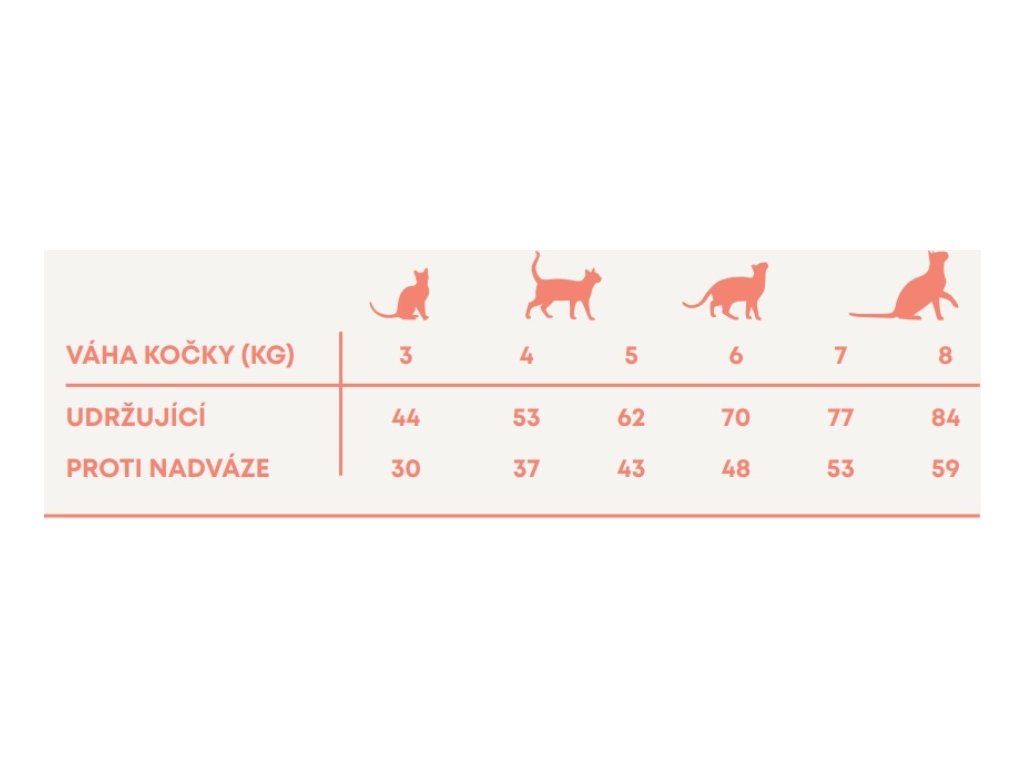 Krmný návod: změnu krmiva je třeba provádět postupně po dobu 7 dní. Jako návod použijte tabulku s dávkováním. Denní množství potravy se může pro každou kočku lišit, záleží na úrovni její aktivity, plemeni a podmínkách prostředí. Denní krmnou dávku podávejte rozdělenou na 2 porce denně, nepoužívejte zbytky krmiva z předchozího dne. Kočka musí mít vždy přístup k čisté, čerstvé vodě.