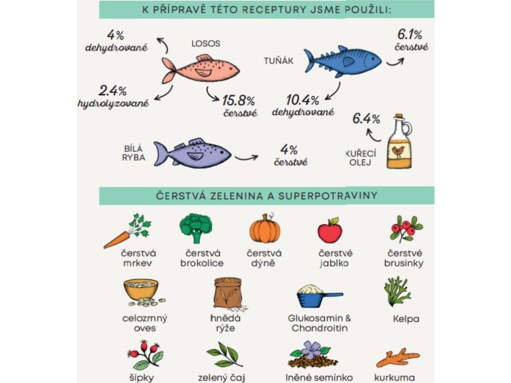 Složení: čerstvý losos 15,8 %, celý zelený hrášek, dehydrovaný tuňák 10,4 %, extrudovaná rýže, čerstvý tuňák 6,1 %, celozrnná rýže, kuřecí olej (chráněno přírodními tokoferoly) 6,4 %, hráškový protein, celozrnný ječmen, dehydrovaný losos 4 %, čerstvé bílé ryby 4 %, rýžový protein, celozrnný oves, lososový hydrolyzát 2,4 %, lněné semínko (přírodní zdroj mastných kyselin ω3), řepné řízky, jablečná vláknina, kvasnice (Saccharomyces cerevisiae), minerální látky, čerstvá brokolice 1000 mg/kg, čerstvá dýně 1000 mg/kg, čerstvá jablka 1000 mg/kg, čerstvá mrkev 1000 mg/kg, glukosamin 1000 mg/kg, chondroitin 600 mg/kg, hydrolyzovaná buněčná stěna kvasnic (zdroj MOS) 500 mg/kg, čekanka (zdroj FOS) 500 mg/kg, výtažek z mandarinky 500 mg/kg, Yucca schidigera 200 mg/kg, řasa Kelpa 30 mg/kg, klikva celé plody 30 mg/kg, šípky (bohaté na vitamín C) 30 mg/kg, zelený čaj 30 mg/kg, kurkuma 30 mg/kg.