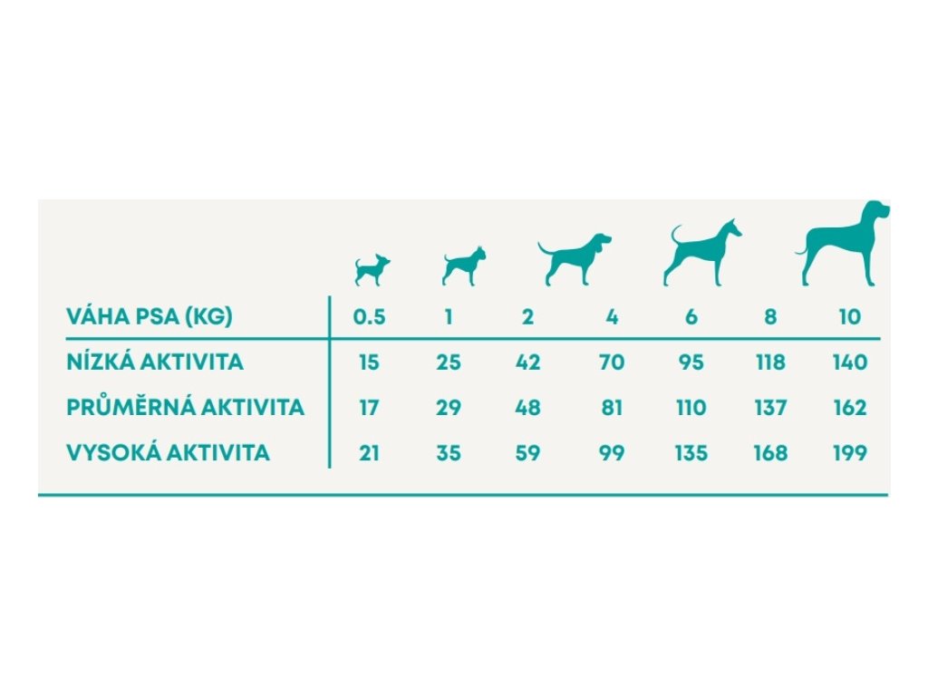 Krmný návod: změnu krmiva je třeba provádět postupně po dobu 7 dní. Jako návod použijte tabulku s dávkováním. Denní množství potravy se může pro každého psa lišit, záleží na úrovni jeho aktivity, plemeni a podmínkách prostředí. Denní krmnou dávku podávejte přednostně rozdělenou na 2 až 3 porce denně, a to vždy ve stejnou dobu. Pes musí mít vždy přístup k čisté, čerstvé vodě. Skladování: skladujte na chladném a suchém místě. Obal by měl být po použití vždy bezpečně uzavřen.