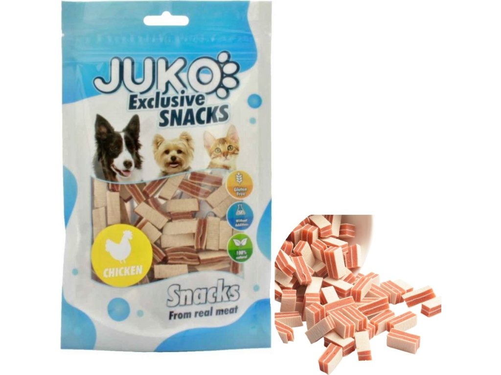 Složení: kuřecí maso, rybí pasta, kukuřičný škrob, sorbitol, glycerin, rostlinný protein, sůl, sorbát draselný.