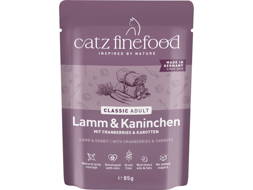 Krmivo pro kočky, které obsahuje vysoký podíl jehněčího a králičího masa, brusinky a mrkev. Bez konzervantů, umělých barviv a dochucovadel. Neobsahuje geneticky upravené suroviny. Jedná se o kompletní krmivo. Složení: jehněčí maso 49% (srdce, svalovina, játra, plíce), jehněčí a králičí vývar 23,6%, králičí maso 21%, brusinky 3%, mrkev 2%, minerály 1%, vaječné skořápky 0,2%, pupalkový olej 0,2% Analýza: hrubé proteiny 10,5%, hrubý tuk 7,5%, hrubý popel 2,9%, hrubá vláknina 0,4%, vlhkost 76% Nutriční doplňkové látky: vitamín D3 200 IE, taurin 1500 mg, zinek 25 mg, mangan 1,4 mg, jód 0,75 mg Doporučené dávkování: 3-5% tělesné hmotnosti kočky denně. Krmnou dávku přizpůsobte váze, věku a aktivitě kočky. Zajistěte dostatek pitné vody. Datum minimální trvanlivosti a číslo šarže najdete na zadní straně obalu. Krmivo skladujte v suchu. Po otevření skladujte v lednici a co nejdříve spotřebujte. Catz finefood – lahodné kapsičky a konzervy pro kočky, kvalitní krmivo vyrobené v Německu! Zodpovědný chov koček začíná už výběrem potravy. Vitalita a zdraví zvířete závisí totiž velkou měrou právě na tom, čím Vaší kočku krmíte. Catz finefood je zdravé a vyvážené krmivo pro kočky. Jednotlivé porce krmiva jsou připravené tak, aby odpovídali přirozené potravě koček – kořisti. Catz finefood spojuje místní charakter jednotlivých regionů s dlouholetou zkušeností a znalostí výroby kočičího krmiva nejvyšší kvality. Všechny suroviny jsou odebírány od prověřených a převážně německých producentů. Při výrobě Catz finefood je kladen velký důraz na transparentnost výrobního procesu. Zásadně bez používání příměsí, barviv a feromonů stejně jako podřadných proteinů. Z tohoto důvodu Catz finefood neobsahuje: - žádný masový separát, - žádnou kostní moučku, - žádné proteinové náhražky jako je sója, - žádné obiloviny, - žádná umělá barviva, - žádné feromony, - žádná umělá aromata, - žádné geneticky upravené suroviny, a žádné konzervační látky. Podle názoru koček je Catz finefood chutné a zdravé! Mňauuu!