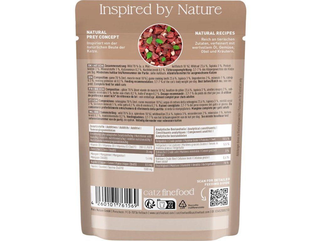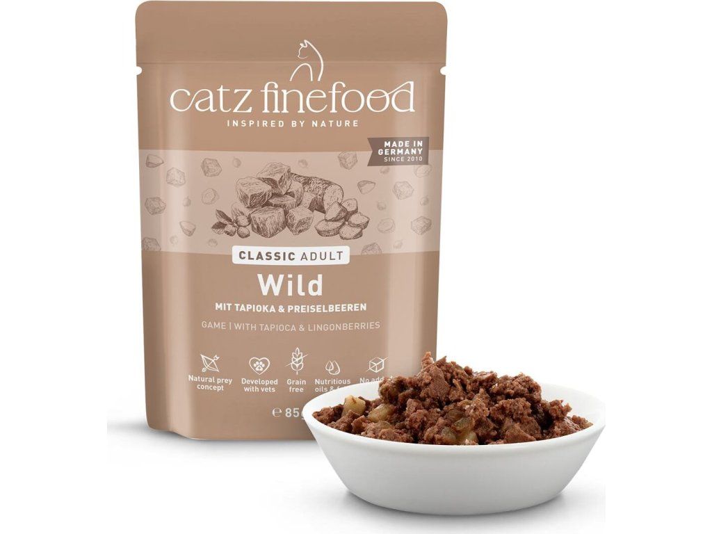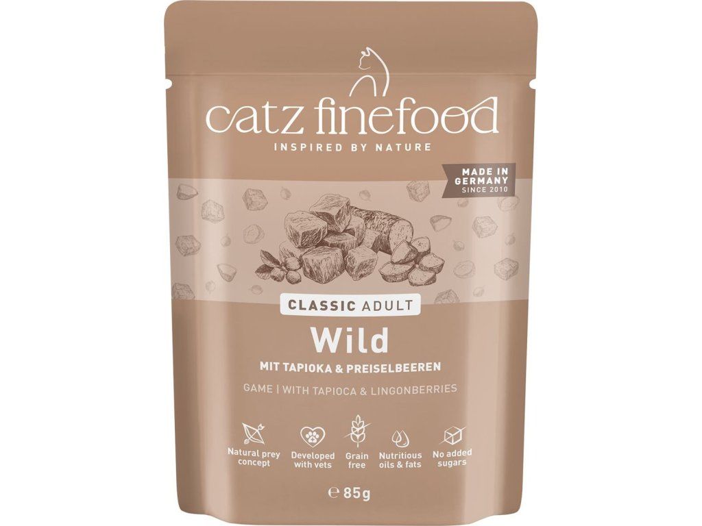 Kompletní krmivo pro kočky, které obsahuje vysoký podíl zvěřiny a vývaru, tapioku, brusinky, šantu kočičí a pupalkový olej. Bez konzervantů, umělých barviv a dochucovadel. Neobsahuje geneticky upravené suroviny. Složení: zvěřina 70% (včetně svaloviny 10%), zvěřinový vývar 23,6%, tapioka 3%, brusinky 2%, minerály 1 %, šanta kočičí 0,2%, pupalkový olej 0,2% Analýza: hrubé proteiny 10,5%, hrubý tuk 5,5%, hrubá vláknina 0,4%, hrubý popel 3%, vlhkost 78% Nutriční doplňkové látky: vitamín D3 200 IE, taurin 1500 mg, zinek 25 mg, mangan 1,4 mg, jód 0,75 mg Doporučené dávkování: 3-5 % tělesné hmotnosti kočky denně. Krmnou dávku přizpůsobte váze, věku a aktivitě kočky. Zajistěte dostatek pitné vody. Datum minimální trvanlivosti a číslo šarže najdete na zadní straně obalu. Krmivo skladujte v suchu. Po otevření skladujte v lednici a co nejdříve spotřebujte. Catz finefood – lahodné kapsičky a konzervy pro kočky, kvalitní krmivo vyrobené v Německu! Zodpovědný chov koček začíná už výběrem potravy. Vitalita a zdraví zvířete závisí totiž velkou měrou právě na tom, čím Vaší kočku krmíte. Catz finefood je zdravé a vyvážené krmivo pro kočky. Jednotlivé porce krmiva jsou připravené tak, aby odpovídali přirozené potravě koček – kořisti. Catz finefood spojuje místní charakter jednotlivých regionů s dlouholetou zkušeností a znalostí výroby kočičího krmiva nejvyšší kvality. Všechny suroviny jsou odebírány od prověřených a převážně německých producentů. Při výrobě Catz finefood je kladen velký důraz na transparentnost výrobního procesu. Zásadně bez používání příměsí, barviv a feromonů stejně jako podřadných proteinů. Z tohoto důvodu Catz finefood neobsahuje: - žádný masový separát, - žádnou kostní moučku, - žádné proteinové náhražky jako je sója, - žádné obiloviny, - žádná umělá barviva, - žádné feromony, - žádná umělá aromata, - žádné geneticky upravené suroviny, - žádné konzervační látky.
