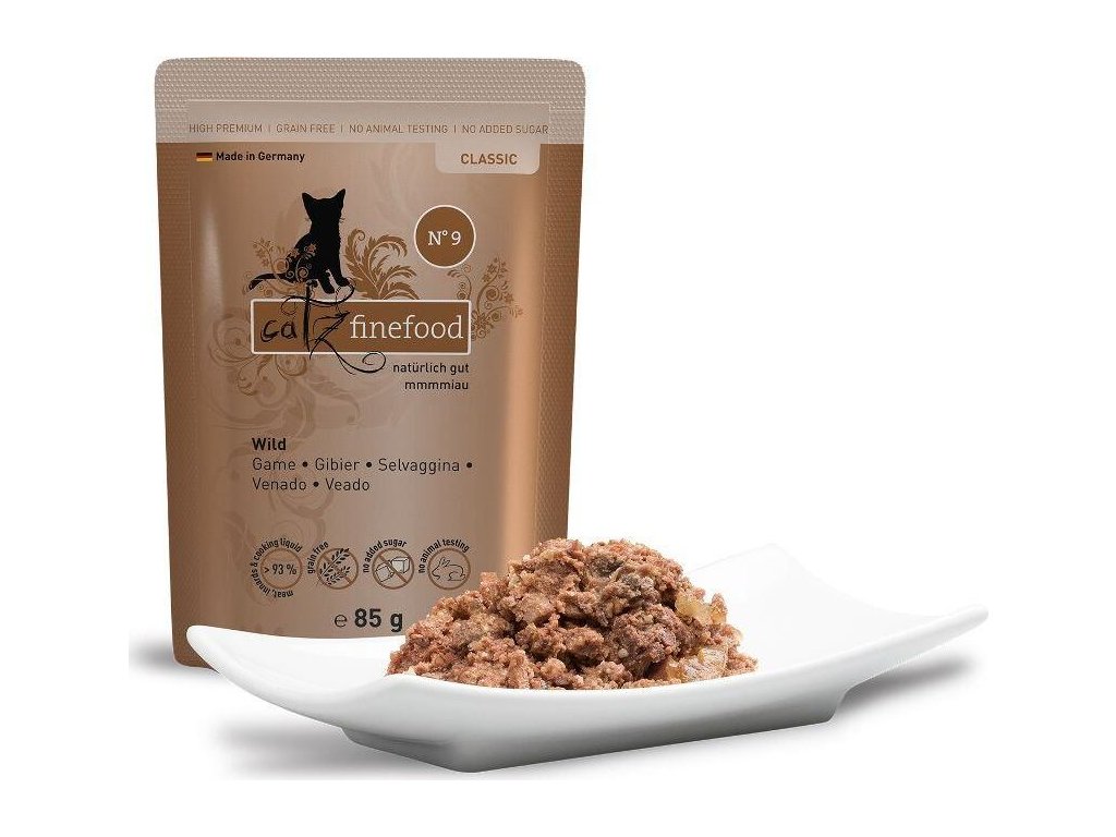 Lahodná kapsička pro kočky, která obsahuje vysoký podíl zvěřiny, zdraví prospěšné brusinky a brambory. Konzervy Catz finefood obsahují pouze suroviny vysoké potravinářské kvality a svým složením odpovídají přirozené kočičí stravě. Jsou bez konzervantů, umělých barviv a dochucovadel. Konzervy neobsahují geneticky upravené suroviny. Jedná se o kompletní krmivo. Složení: zvěřina 70% (srdce, svalovina, játra a plíce), zvěřinový vývar 23,6%, brambory 3%, brusinky 2%, minerály 1 %, rozmarýn 0,2%, dýňový olej 0,2% Analýza: hrubé proteiny 10,5%, hrubý tuk 6,5%, hrubá vláknina 0,4%, hrubý popel 2,5%, vlhkost 77% Nutriční doplňkové látky: vitamín D3 200 IE, taurin 1500 mg, zinek 25 mg, mangan 1,4 mg, jód 0,75 mg Doporučené dávkování: 3-5 % tělesné hmotnosti kočky denně. Krmnou dávku přizpůsobte váze, věku a aktivitě kočky. Zajistěte dostatek pitné vody. Datum minimální trvanlivosti a číslo šarže najdete na zadní straně obalu. Krmivo skladujte v suchu. Po otevření skladujte v lednici a co nejdříve spotřebujte. Catz finefood – lahodné kapsičky a konzervy pro kočky, kvalitní krmivo vyrobené v Německu! Zodpovědný chov koček začíná už výběrem potravy. Vitalita a zdraví zvířete závisí totiž velkou měrou právě na tom, čím Vaší kočku krmíte. Catz finefood je zdravé a vyvážené krmivo pro kočky. Jednotlivé porce krmiva jsou připravené tak, aby odpovídali přirozené potravě koček – kořisti. Catz finefood spojuje místní charakter jednotlivých regionů s dlouholetou zkušeností a znalostí výroby kočičího krmiva nejvyšší kvality. Všechny suroviny jsou odebírány od prověřených a převážně německých producentů. Při výrobě Catz finefood je kladen velký důraz na transparentnost výrobního procesu. Zásadně bez používání příměsí, barviv a feromonů stejně jako podřadných proteinů. Z tohoto důvodu Catz finefood neobsahuje: - žádný masový separát, - žádnou kostní moučku, - žádné proteinové náhražky jako je sója, - žádné obiloviny, - žádná umělá barviva, - žádné feromony, - žádná umělá aromata, - žádné geneticky upravené suroviny, a žádné konzervační látky. Podle názoru koček je Catz finefood chutné a zdravé! Mňauuu!