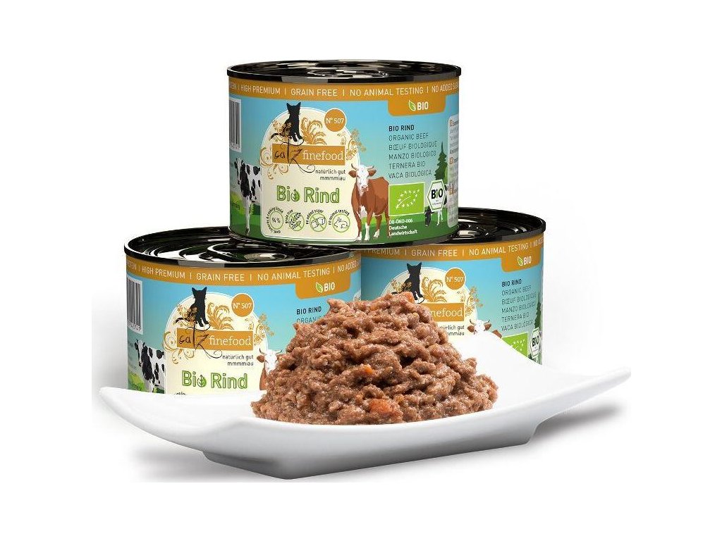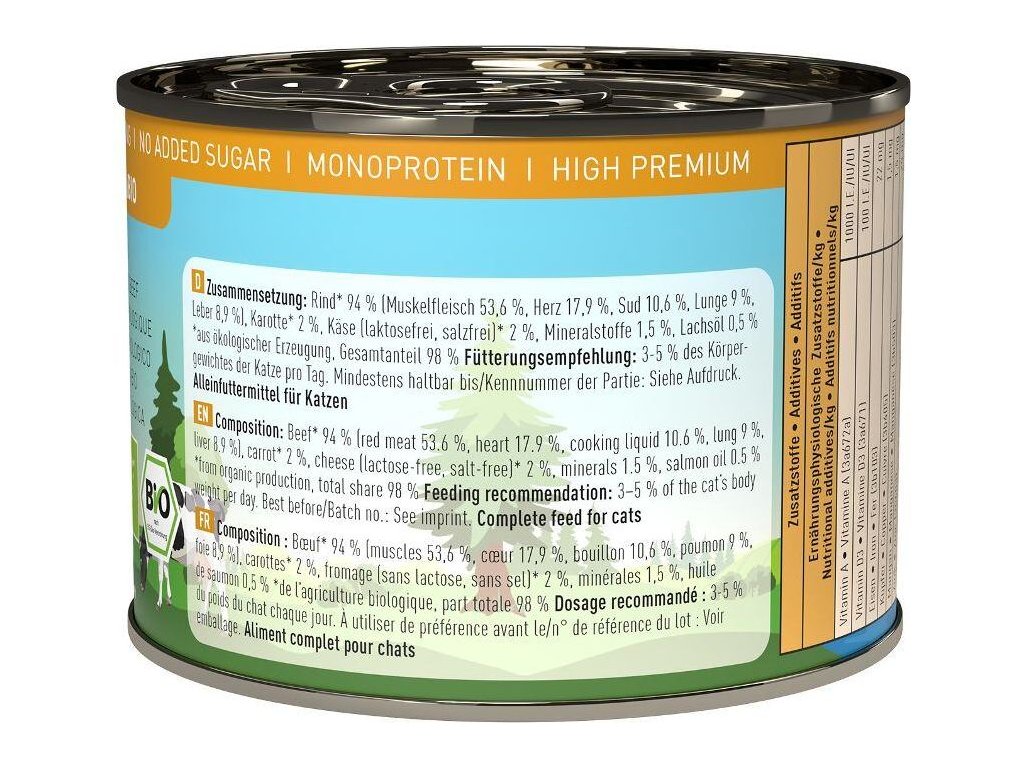 Kompletní monoproteinové krmivo v bio kvalitě, které zajistí vaší kočce vyváženou stravu. Všechny suroviny jsou certifikované a pochází z ekologického zemědělství. Kočky milují výtečnou chuť čerstvě zpracovaného masa a drobů té nejvyšší kvality. Krmivo Catz finefood Bio je ideální také pro kočky s citlivým zažíváním či potravinovými alergiemi. Krmivo neobsahuje konzervanty, umělá barviva, dochucovadla a geneticky upravené suroviny. - Bezobilná receptura - Žádná masokostní moučka - Bez přidaného cukru - Žádná dochucovadla, umělá barviva a konzervanty - Žádné geneticky modifikované suroviny - Žádné levné náhrady bílkovin Certifikace zajišťuje, že všechny použité suroviny pochází z hospodářských zvířat či ovoce a zeleniny z certifikovaného ekologického zemědělství. Zaručuje nejvyšší úroveň kvality bez použití preventivních antibiotik, růstových stimulátorů, syntetických pesticidů a hnojiv. Složení: hovězí 94 % (svalovina 53,6 %, srdce 17,9%, vývar 10,6 %, plíce 9 %, játra 8,9 %), mrkev 2 %, sýr (bez laktózy, bez soli) 2 %, minerální látky 1,5 %, lososový olej 0,5 % Analýza: hrubé bílkoviny 12 %, hrubé oleje a tuky 10,2 %, hrubé popeloviny 1,5 %, hrubá vláknina 0,3 %, vlhkost 75,6 % Nutriční doplňkové látky na 1 kg: vitamin A 1000 I.E., Vitamin D3 100 I.E., železo 22 mg, měď 1,5 mg, mangan 1,5 mg, zinek 25 mg, selen 0,1 mg, taurin 1300 mg Doporučené dávkování: 3-5 % tělesné hmotnosti kočky denně. Krmnou dávku přizpůsobte váze, věku a aktivitě kočky. Zajistěte dostatek pitné vody. Datum minimální trvanlivosti a číslo šarže najdete na zadní straně obalu. Krmivo skladujte v suchu. Po otevření skladujte v lednici a co nejdříve spotřebujte.