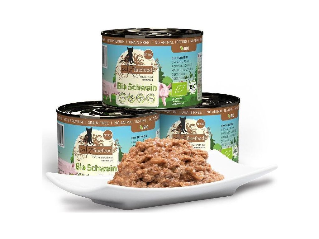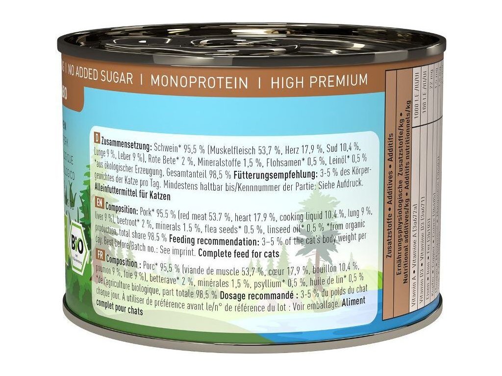 Kompletní monoproteinové krmivo v bio kvalitě, které zajistí vaší kočce vyváženou stravu. Všechny suroviny jsou certifikované a pochází z ekologického zemědělství. Kočky milují výtečnou chuť čerstvě zpracovaného masa a drobů té nejvyšší kvality. Krmivo Catz finefood Bio je ideální také pro kočky s citlivým zažíváním či potravinovými alergiemi. Krmivo neobsahuje konzervanty, umělá barviva, dochucovadla a geneticky upravené suroviny. - Bezobilná receptura - Žádná masokostní moučka - Bez přidaného cukru - Žádná dochucovadla, umělá barviva a konzervanty - Žádné geneticky modifikované suroviny - Žádné levné náhrady bílkovin Certifikace zajišťuje, že všechny použité suroviny pochází z hospodářských zvířat či ovoce a zeleniny z certifikovaného ekologického zemědělství. Zaručuje nejvyšší úroveň kvality bez použití preventivních antibiotik, růstových stimulátorů, syntetických pesticidů a hnojiv. Složení: vepřové maso 95,5 % (svalovina 53,7 %, srdce 17,9 %, vývar 10,4 %, plíce 9 %, játra 9 %), červená řepa 2 %, minerální látky 1,5 %, psyllium 0,5 %, lněný olej 0,5 % Analýza: hrubé bílkoviny 12,4 %, hrubé oleje a tuky 9,3 %, hrubé popeloviny 1,3 %, hrubá vláknina 0,3 %, vlhkost 74 % Nutriční doplňkové látky na 1 kg: vitamin A 1000 I.E., Vitamin D3 100 I.E., železo 22 mg, měď 1,5 mg, mangan 1,5 mg, zinek 25 mg, selen 0,1 mg, taurin 1300 mg Doporučené dávkování: 3-5 % tělesné hmotnosti kočky denně. Krmnou dávku přizpůsobte váze, věku a aktivitě kočky. Zajistěte dostatek pitné vody. Datum minimální trvanlivosti a číslo šarže najdete na zadní straně obalu. Krmivo skladujte v suchu. Po otevření skladujte v lednici a co nejdříve spotřebujte.