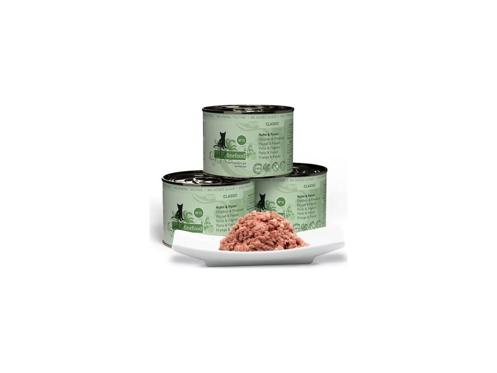 Lahodná konzerva pro kočky, která obsahuje vysoký podíl kuřecího a bažantího masa, zdraví prospěšnou řeřichu a smetánku lékařskou. Konzervy Catz finefood obsahují pouze suroviny vysoké potravinářské kvality a svým složením odpovídají přirozené kočičí stravě. Jsou bez konzervantů, umělých barviv a dochucovadel. Konzervy neobsahují geneticky upravené suroviny. Jedná se o kompletní krmivo. Složení: kuřecí maso 50% (srdce, svalovina, játra, žaludek, krk a tuk), kuřecí a bažantí vývar 23,3 %, bažantí maso 20%, quinoa 3%, řeřicha 2%, minerály 1%, smetánka lékařská 0,5%, pupalkový olej 0,2% Analýza: hrubé proteiny 10,2%, hrubý tuk 5,2%, hrubý popel 2,8%, hrubá vláknina 0,4%, vlhkost 80% Nutriční doplňkové látky: vitamín D3 200 I.E., taurin 1500mg, zinek 25 mg, mangan 1,4 mg, jód 0,75 mg, měď 1 mg Doporučené dávkování: 3-5% tělesné hmotnosti kočky denně. Krmnou dávku přizpůsobte váze, věku a aktivitě kočky. Zajistěte dostatek pitné vody. Datum minimální trvanlivosti a číslo šarže najdete na zadní straně obalu. Krmivo skladujte v suchu. Po otevření skladujte v lednici a co nejdříve spotřebujte. Catz finefood – lahodné kapsičky a konzervy pro kočky, kvalitní krmivo vyrobené v Německu! Zodpovědný chov koček začíná už výběrem potravy. Vitalita a zdraví zvířete závisí totiž velkou měrou právě na tom, čím Vaší kočku krmíte. Catz finefood je zdravé a vyvážené krmivo pro kočky. Jednotlivé porce krmiva jsou připravené tak, aby odpovídali přirozené potravě koček – kořisti. Catz finefood spojuje místní charakter jednotlivých regionů s dlouholetou zkušeností a znalostí výroby kočičího krmiva nejvyšší kvality. Všechny suroviny jsou odebírány od prověřených a převážně německých producentů. Při výrobě Catz finefood je kladen velký důraz na transparentnost výrobního procesu. Zásadně bez používání příměsí, barviv a feromonů stejně jako podřadných proteinů. Z tohoto důvodu Catz finefood neobsahuje: - žádný masový separát, - žádnou kostní moučku, - žádné proteinové náhražky jako je sója, - žádné obiloviny, - žádná umělá barviva, - žádné feromony, - žádná umělá aromata, - žádné geneticky upravené suroviny, a žádné konzervační látky. Podle názoru koček je Catz finefood chutné a zdravé! Mňauuu!