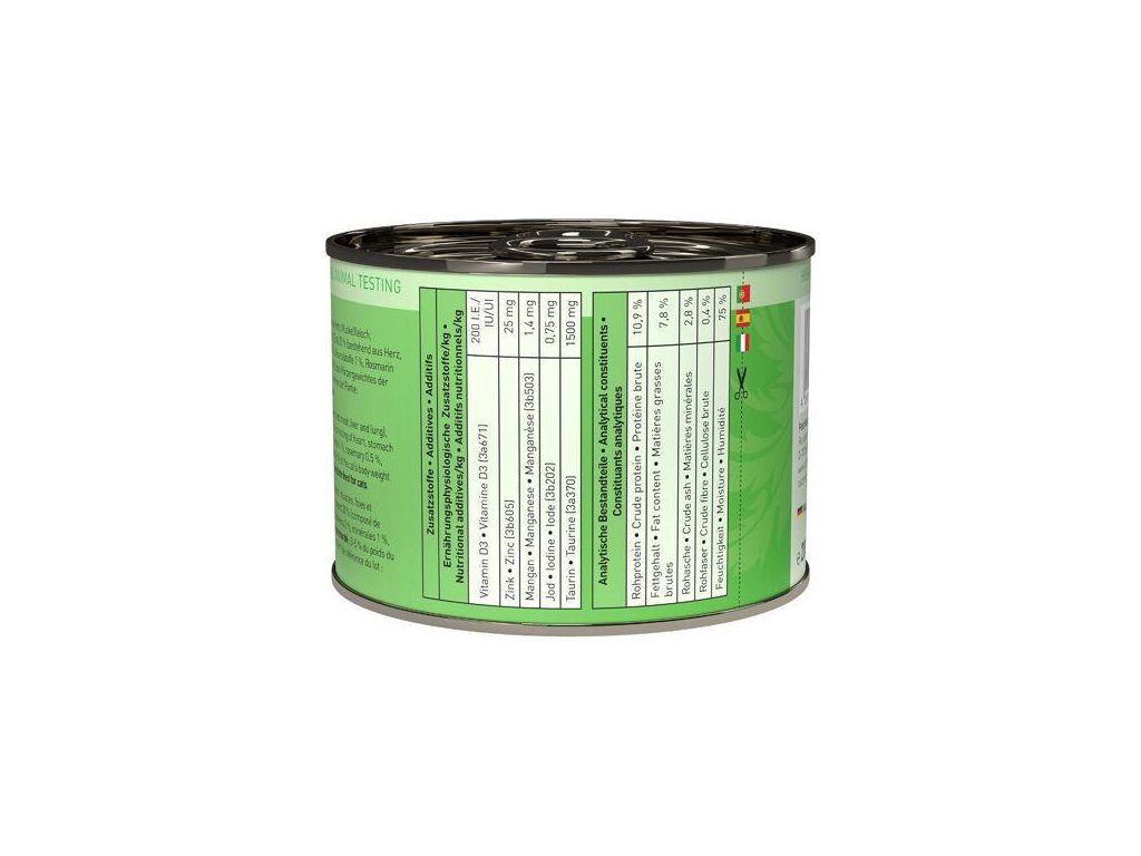 Lahodná konzerva pro kočky, která obsahuje vysoký podíl hovězího a kachního masa, zdraví prospěšné brusinky a aloe vera. Konzervy Catz finefood obsahují pouze suroviny vysoké potravinářské kvality a svým složením odpovídají přirozené kočičí stravě. Jsou bez konzervantů, umělých barviv a dochucovadel. Konzervy neobsahují geneticky upravené suroviny. Jedná se o kompletní krmivo. Složení: hovězí maso 50% (srdce, svalovina, játra a plíce), hovězí a kachní vývar 23,3%, kachní maso 20% (srdce, žaludek a krk), brusinky 3%, aloe vera 2%, minerály 1 %, rozmarýn 0,5%, řepkový olej 0,2% Analýza: hrubé proteiny 10,9%, hrubý tuk 7,8%, hrubý popel 2,8%, hrubá vláknina 0,4%, vlhkost 75% Nutriční doplňkové látky: vitamín D3 200 IE, taurin 1500 mg, zinek 25 mg, mangan 1,4 mg, jód 0,75 mg Doporučené dávkování: 3-5% tělesné hmotnosti kočky denně. Krmnou dávku přizpůsobte váze, věku a aktivitě kočky. Zajistěte dostatek pitné vody. Datum minimální trvanlivosti a číslo šarže najdete na zadní straně obalu. Krmivo skladujte v suchu. Po otevření skladujte v lednici a co nejdříve spotřebujte. Catz finefood – lahodné kapsičky a konzervy pro kočky, kvalitní krmivo vyrobené v Německu! Zodpovědný chov koček začíná už výběrem potravy. Vitalita a zdraví zvířete závisí totiž velkou měrou právě na tom, čím Vaší kočku krmíte. Catz finefood je zdravé a vyvážené krmivo pro kočky. Jednotlivé porce krmiva jsou připravené tak, aby odpovídali přirozené potravě koček – kořisti. Catz finefood spojuje místní charakter jednotlivých regionů s dlouholetou zkušeností a znalostí výroby kočičího krmiva nejvyšší kvality. Všechny suroviny jsou odebírány od prověřených a převážně německých producentů. Při výrobě Catz finefood je kladen velký důraz na transparentnost výrobního procesu. Zásadně bez používání příměsí, barviv a feromonů stejně jako podřadných proteinů. Z tohoto důvodu Catz finefood neobsahuje: - žádný masový separát, - žádnou kostní moučku, - žádné proteinové náhražky jako je sója, - žádné obiloviny, - žádná umělá barviva, - žádné feromony, - žádná umělá aromata, - žádné geneticky upravené suroviny, a žádné konzervační látky. Podle názoru koček je Catz finefood chutné a zdravé! Mňauuu!