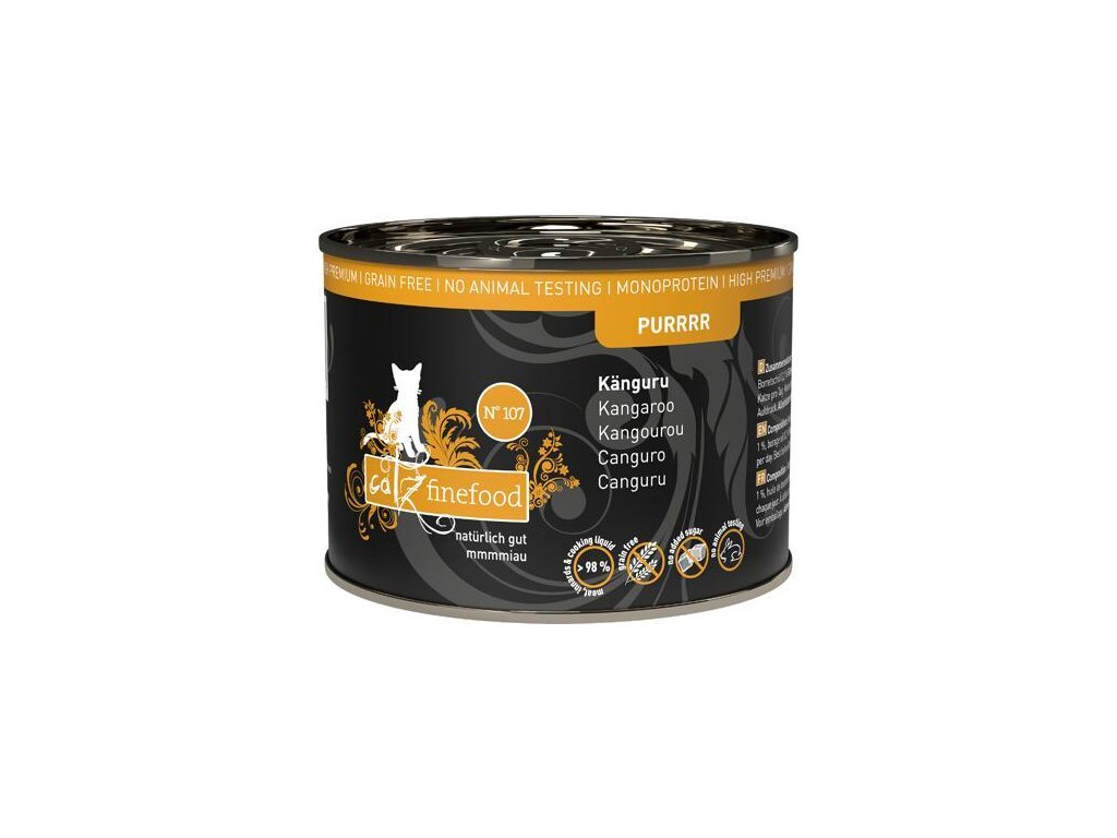Lahodná konzerva pro kočky, která obsahuje pouze klokaní maso, vývar, minerální látky a olej z brutnáku lékařského. Konzerva je tak vhodná i pro kočky s citlivým zažíváním nebo pro alergické kočky. Jedná se o kompletní krmivo. Suroviny jsou vysoké potravinářské kvality a svým složením odpovídají přirozené kočičí stravě. Jsou bez konzervantů, umělých barviv a dochucovadel. Konzervy neobsahují geneticky upravené suroviny. Složení: klokaní maso 70%, klokaní vývar 28,80%, minerály 1%, olej z brutnáku lékařského 0,2% Analýza: hrubé proteiny 10,9%, hrubý tuk 4,5%, hrubý popel 2,5%, hrubá vláknina 0,4%, vlhkost 79% Nutriční doplňkové látky: vitamín D3 200 IE, taurin 1500 mg, zinek 25 mg, mangan 1,4 mg, jód 0,75 mg Doporučené dávkování: 3-5% tělesné hmotnosti kočky denně. Krmnou dávku přizpůsobte váze, věku a aktivitě kočky. Zajistěte dostatek pitné vody. Datum minimální trvanlivosti a číslo šarže najdete na zadní straně obalu. Krmivo skladujte v suchu. Po otevření skladujte v lednici a co nejdříve spotřebujte. Catz finefood – lahodné kapsičky a konzervy pro kočky, kvalitní krmivo vyrobené v Německu! Zodpovědný chov koček začíná už výběrem potravy. Vitalita a zdraví zvířete závisí totiž velkou měrou právě na tom, čím Vaší kočku krmíte. Catz finefood je zdravé a vyvážené krmivo pro kočky. Jednotlivé porce krmiva jsou připravené tak, aby odpovídali přirozené potravě koček – kořisti. Catz finefood spojuje místní charakter jednotlivých regionů s dlouholetou zkušeností a znalostí výroby kočičího krmiva nejvyšší kvality. Všechny suroviny jsou odebírány od prověřených a převážně německých producentů. Při výrobě Catz finefood je kladen velký důraz na transparentnost výrobního procesu. Zásadně bez používání příměsí, barviv a feromonů stejně jako podřadných proteinů. Z tohoto důvodu Catz finefood neobsahuje: - žádný masový separát, - žádnou kostní moučku, - žádné proteinové náhražky jako je sója, - žádné obiloviny, - žádná umělá barviva, - žádné feromony, - žádná umělá aromata, - žádné geneticky upravené suroviny, a žádné konzervační látky. Podle názoru koček je Catz finefood chutné a zdravé! Mňauuu!
