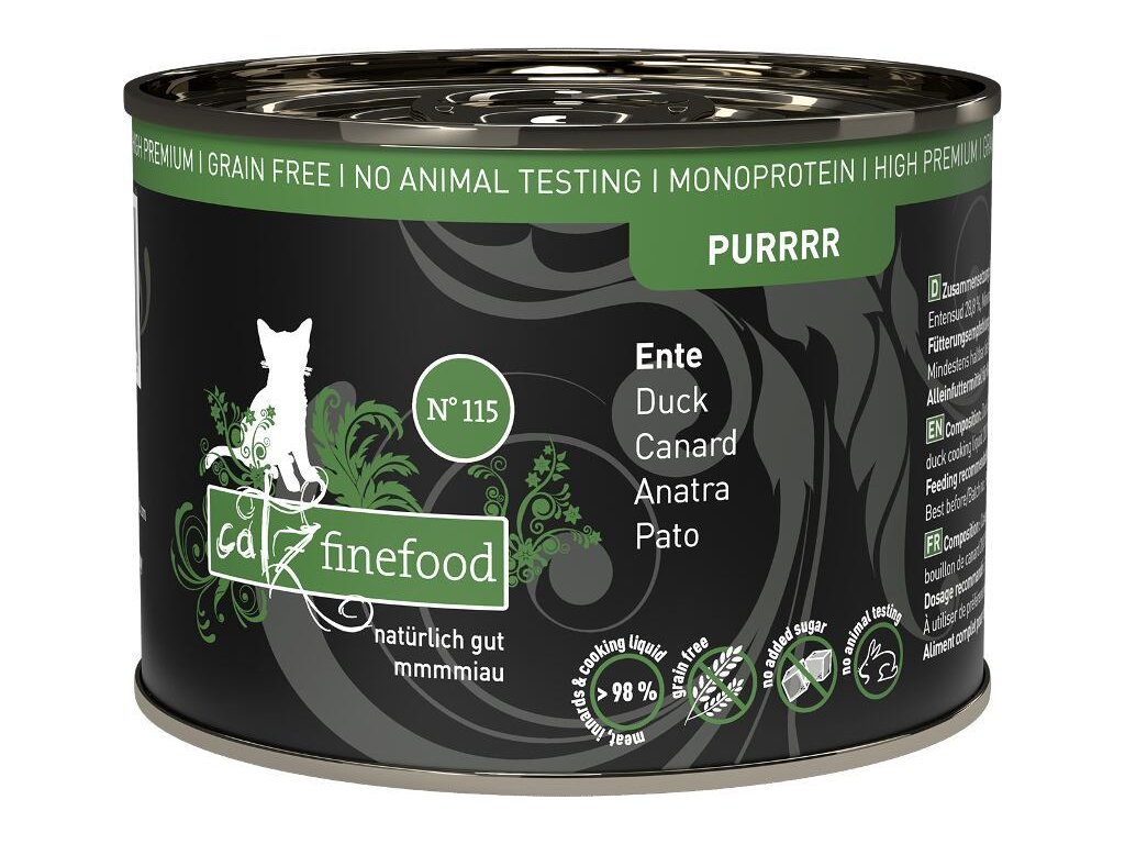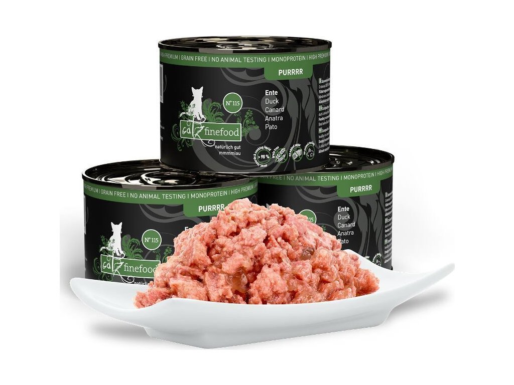 Excelentní konzerva pro kočky, která obsahuje pouze kachní maso, kachní vnitřnosti, kachní vývar, minerální látky a bodlákový olej. Je tak vhodná i pro kočky s citlivým zažíváním nebo pro alergiky. Jedná se o kompletní monoproteinové krmivo pro kočky všech věkových kategorií a plemen. Stejně jako všechna krmiva Petsnature, tato konzerva neobsahuje geneticky upravené suroviny, je bez konzervantů, umělých barviv a dochucovadel. Všechny použité suroviny svým složením odpovídají přirozené kočičí stravě. Složení: kachní maso 70% (srdce, maso, žaludek a krk), kachní vývar 28,8%, minerální látky 1%, bodlákový olej 0,2% Analýza: hrubé bílkoviny 10,2%, hrubé oleje a tuky 5,2%, hrubé popeloviny 2,5%, hrubá vláknina 0,4%, vlhkost 80% Nutriční doplňkové látky: vitamín D3 200 IE, zinek 25 mg, mangan 1,4 mg, měď 1 mg, jód 0,75 mg, taurin 1500 mg Doporučené dávkování: 3-5 % tělesné hmotnosti kočky denně. Krmnou dávku přizpůsobte váze, věku a aktivitě kočky. Zajistěte dostatek pitné vody. Datum minimální trvanlivosti a číslo šarže najdete na zadní straně obalu. Krmivo skladujte v suchu. Po otevření skladujte v lednici a co nejdříve spotřebujte. Catz finefood – lahodné kapsičky a konzervy pro kočky, kvalitní krmivo vyrobené v Německu! Catz finefood spojuje místní charakter jednotlivých regionů s dlouholetou zkušeností a znalostí výroby kočičího krmiva nejvyšší kvality. Suroviny jsou odebírány od prověřených a převážně německých producentů. Při výrobě je kladen velký důraz na transparentnost výrobního procesu. Proto krmivo neobsahuje: - žádný masový separát a kostní moučku - žádné obiloviny a proteinové náhražky jako je sója - žádná umělá barviva a aromata - žádné feromony - žádné geneticky upravené suroviny - žádné konzervační látky Podle názoru koček je Catz finefood prostě chutné, zdravé a neodolatelné krmivo! Mňauuu!