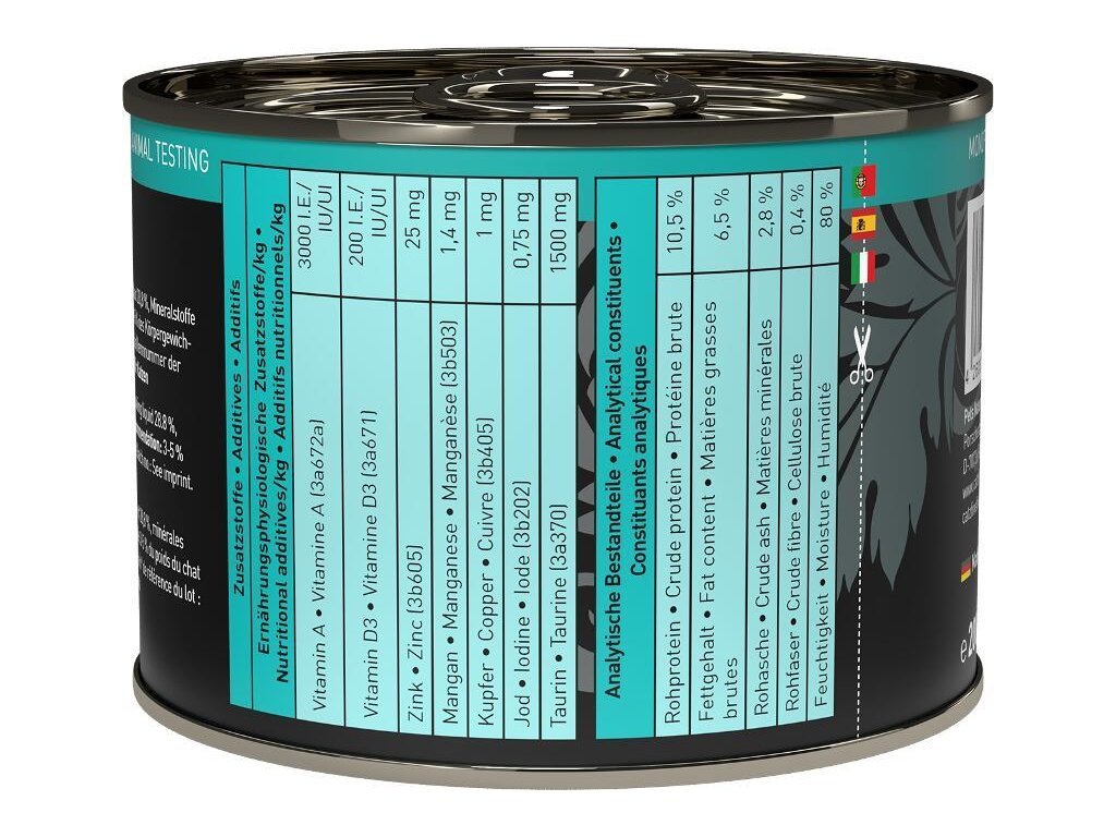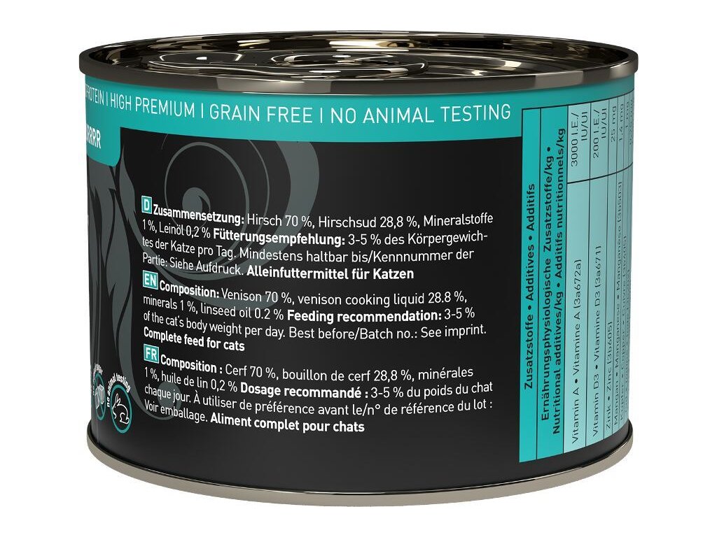 Excelentní konzerva pro kočky, která obsahuje pouze jelení maso, jelení vývar, minerální látky a lněný olej. Je proto vhodná i pro kočky s citlivým zažíváním nebo alergiky. Jedná se o kompletní monoproteinové krmivo pro kočky všech věkových kategorií a plemen. Stejně jako všechna krmiva Petsnature, tato konzerva neobsahuje geneticky upravené suroviny, je bez konzervantů, umělých barviv a dochucovadel a všechny použité suroviny svým složením odpovídají přirozené kočičí stravě. Složení: jelení maso 70%, jelení vývar 28,8%, minerální látky 1%, lněný olej 0,2% Analýza: hrubé bílkoviny 10,5%, hrubé oleje a tuky 6,5%, hrubé popeloviny 2,8%, hrubá vláknina 0,4%, vlhkost 80% Nutriční doplňkové látky: vitamín D3 200 IE, vitamin A 3000 I.E. zinek 25 mg, mangan 1,4 mg, měď 1 mg, jód 0,75 mg, taurin 1500 mg Doporučené dávkování: 3-5 % tělesné hmotnosti kočky denně. Krmnou dávku přizpůsobte váze, věku a aktivitě kočky. Zajistěte dostatek pitné vody. Datum minimální trvanlivosti a číslo šarže najdete na zadní straně obalu. Krmivo skladujte suchu. Po otevření skladujte v lednici a co nejdříve spotřebujte. Catz finefood – lahodné kapsičky a konzervy pro kočky, kvalitní krmivo vyrobené v Německu! Catz finefood spojuje místní charakter jednotlivých regionů s dlouholetou zkušeností a znalostí výroby kočičího krmiva nejvyšší kvality. Suroviny jsou odebírány od prověřených a převážně německých producentů. Při výrobě je kladen velký důraz na transparentnost výrobního procesu. Proto krmivo neobsahuje: - žádný masový separát a kostní moučku - žádné obiloviny a proteinové náhražky jako je sója - žádná umělá barviva a aromata - žádné feromony - žádné geneticky upravené suroviny - žádné konzervační látky Podle názoru koček je Catz finefood prostě chutné, zdravé a neodolatelné krmivo! Mňauuu!