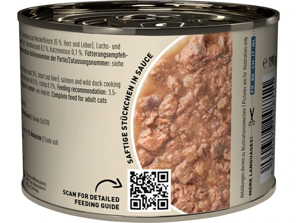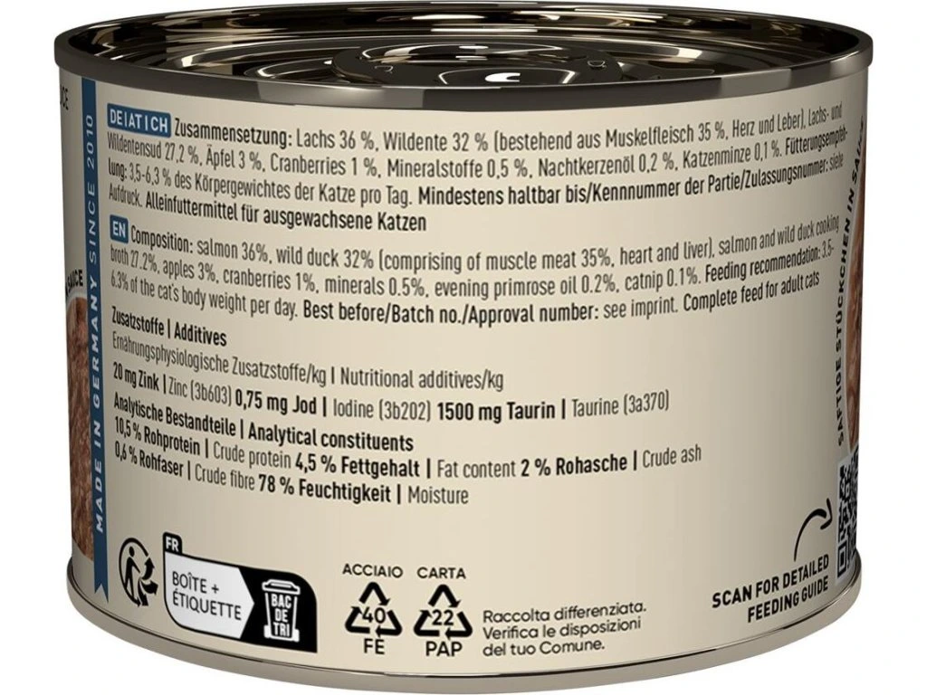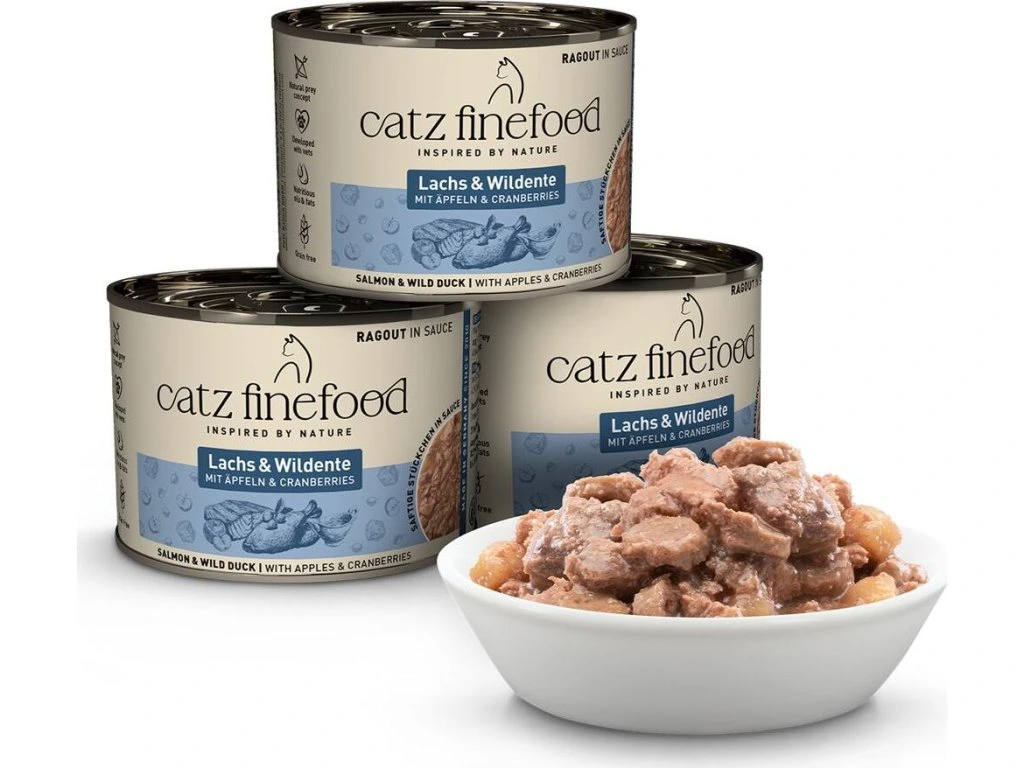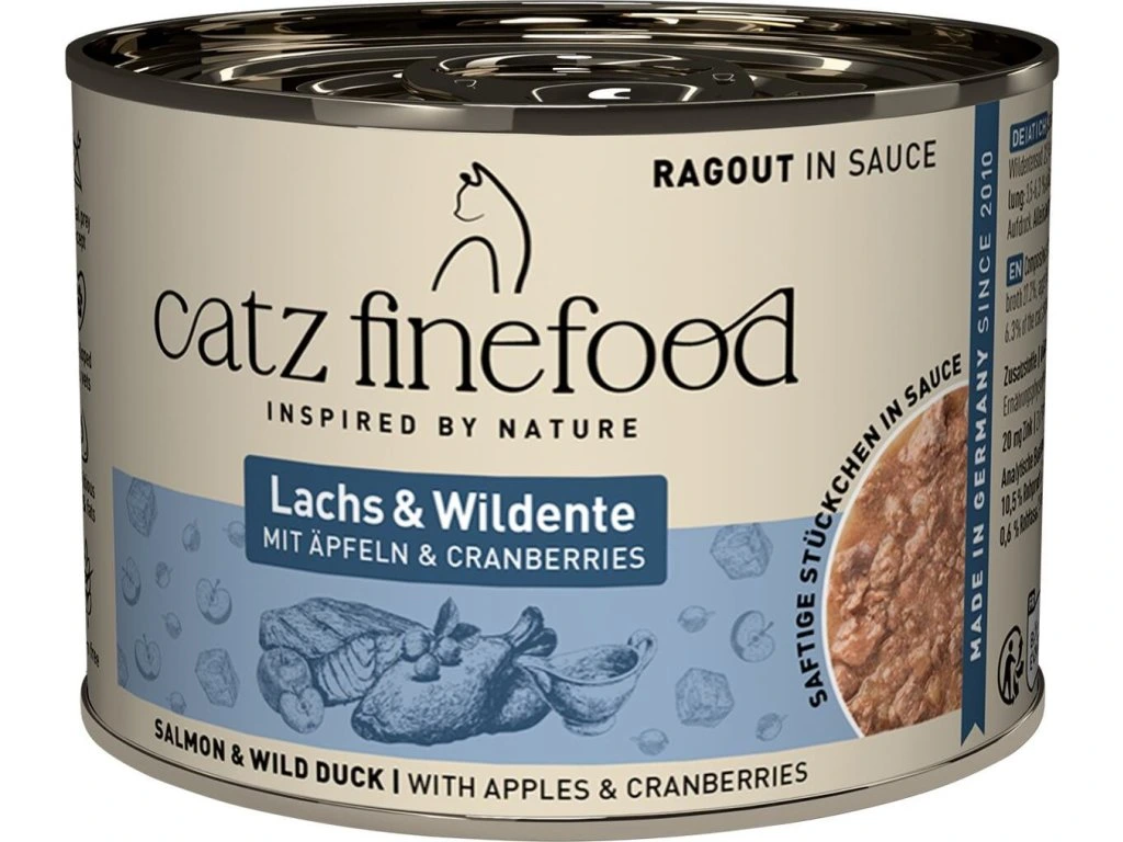 Catz Finefood Ragout je kompletní mokré krmivo, které obsahuje jemné masové kousky v omáčce a je vhodné i pro vybíravé kočky, které mají rády šťavnatější konzistenci. Receptura vychází z přirozených potřeb koček – vysoký podíl masa doplňuje malé množství ovoce a rostlinných složek. Jablka a brusinky – zdroj vitamínů, ovocných kyselin, vlákniny a antioxidantů Pupalkový olej – obsahuje esenciální mastné kyseliny Šanta kočičí – bylinka, která může podporovat chuť k jídlu Stejně jako ostatní krmiva Catz Finefood neobsahuje: konzervanty, umělá barviva, dochucovadla, geneticky modifikované suroviny. Složení: losos 36 %, divoká kachna 32 % (z toho svalovina 35 %, srdce a játra), vývar z lososa a kachny 27,2 %, jablka 3 %, brusinky 1 %, minerální látky 0,5 %, pupalkový olej 0,2 %, šanta kočičí 0,1 % Analýza: hrubý protein 10,5 %, hrubý tuk 4,5 %, hrubý popel 2 %, hrubá vláknina 0,6 %, vlhkost 78 % Nutriční doplňkové látky na 1 kg: taurin (3a370) 1 500 mg, zinek (3b603) 20 mg, jód (3b202) 0,75 mg Doporučené dávkování: Krmná dávka vždy závisí na aktivitě, věku, velikosti, plemenu a zdraví kočky. Podávejte nejlépe v menších porcích, dle potřeby, 3 - 5% tělesné hmotnosti kočky denně. Datum minimální trvanlivosti a číslo šarže najdete na obalu. Krmivo skladujte v suchu. Po otevření skladujte v lednici a co nejdříve spotřebujte.