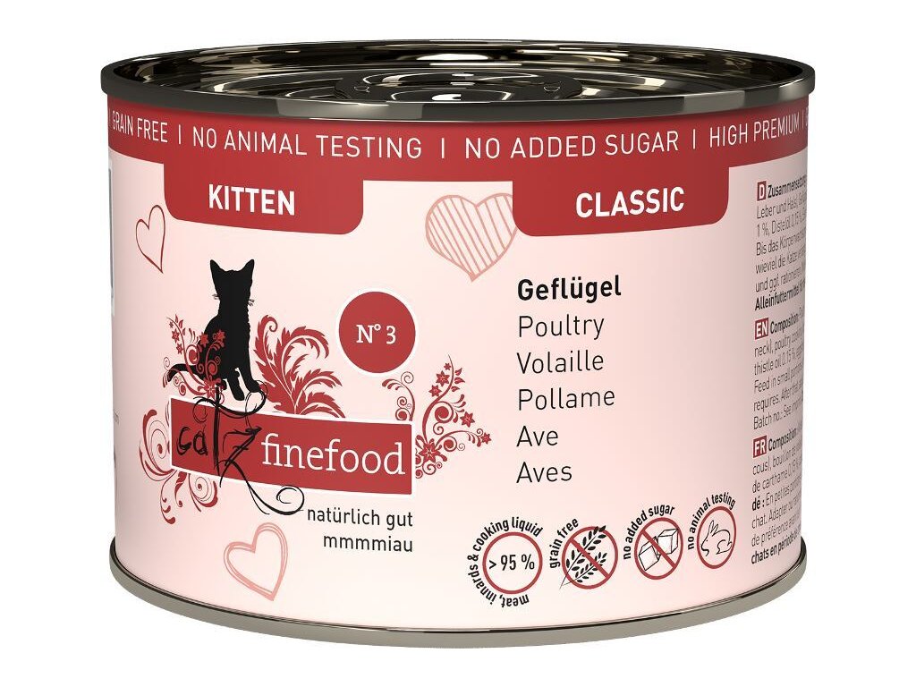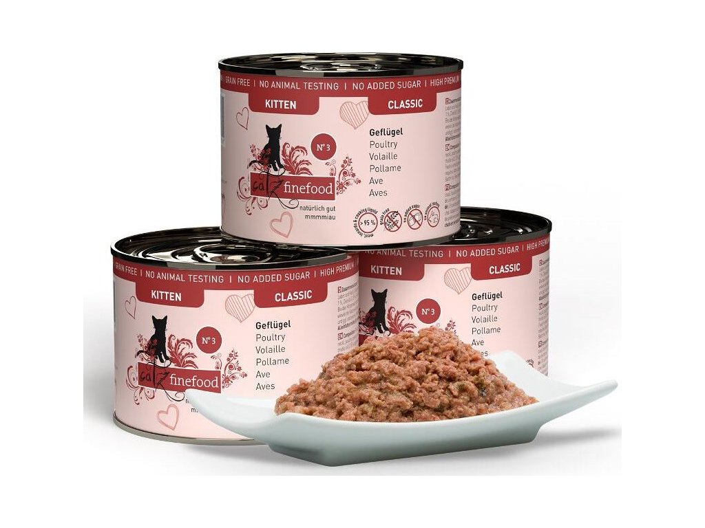 Jemné drůbeží masíčko v kombinaci s brusinkami a smetánkou lékařskou je prvotřídním kompletním krmivem a neodolatelnou pochoutkou pro koťata všech plemen. Potěší i ty nejvybíravější a je vhodné i pro kočky s citlivým zažíváním nebo pro březí a kojící dospělé kočky. Kvalitní ingredience jsou základ Drůbeží maso je lehce stravitelné. Obsahuje málo tuku, má nižší energetickou hodnotu a celkově bývá dobře přijímáno. Brusinky jsou jedním z nejúčinnějších přírodních antioxidantů, působí protizánětlivě a mají pozitivní vliv zejména na zdraví močového ústrojí. Smetánka lékařská podporuje trávení a celkovou látkovou výměnu, pomáhá i při zánětech močových cest a rozpouštění ledvinových kamenů. Bodlákový olej je pro kočičí tělo lehce stravitelný a obsahuje vysoké množství nenasycených mastných kyselin, kyseliny linolové a vitamínu E. Pozitivně tak působí na celý organismus. Moučka z vaječných skořápek je výborným přírodním zdrojem vápníku, fosforu a jiných stopových prvků, nezbytných pro správný vývoj rostoucího kotěte. Efektivně nahrazuje syrové kosti, které jsou běžnou součástí potravy volně žijících koček. Měsíček lékařský podporuje trávení, činnost jater a střev a pozitivně ovlivňuje stav srsti a kůže. Stejně jako všechna krmiva Catz finefood, tato kapsička neobsahuje geneticky upravené suroviny, je bez konzervantů, umělých barviv a dochucovadel. Všechny použité suroviny svým složením odpovídají přirozené kočičí stravě. Složení: drůbeží maso 69% (svalovina, srdce, žaludek, játra a krk), drůbeží vývar 26,65%, brusinky 2%, smetánka lékařská 1%, minerální látky 1%, bodlákový olej 0,15%, vaječné skořápky 0,1%, měsíček lékařský 0,1% Analýza: hrubé bílkoviny 11%, hrubé oleje a tuky 5,9%, hrubé popeloviny 2,2%, hrubá vláknina 0,5%, vlhkost 80% Nutriční doplňkové látky: vitamín D3 200 IE, zinek 25 mg, mangan 1,4 mg, měď 1 mg, jód 0,75 mg, taurin 1500 mg Doporučené dávkování: Krmivo podávejte v malých dávkách několikrát denně, až do ukončení tělesného růstu. Krmnou dávku a počet krmných dávek upravte podle vývoje tělesné stavby, váhy a aktivity kotěte. Pokud si nejste jistí správným dávkováním, poraďte se se svým veterinářem. Zajistěte dostatek pitné vody. Datum minimální trvanlivosti a číslo šarže najdete na zadní straně obalu. Krmivo skladujte suchu. Po otevření skladujte v lednici a co nejdříve spotřebujte. Správná strava je základem pevného zdraví každé kočky. Protože v porovnání s dospělými kočkami mají koťata specifické výživové potřeby, a i samotný způsob podávání krmiva se liší, je důležité věnovat výživě a složení jejich stravy maximum pozornosti. Koťata rostou velice rychle, ale jejich trávicí soustava se vyvíjí pomalu. Zároveň mají velmi malý žaludek, a proto je důležité, aby jejich strava byla opravdu bohatá na živiny, vitamíny a minerály. Přesně taková je řada kapsiček a konzerv pro koťata Catz finefood Classic Kitten. Jedná se o kompletní krmivo s vysokým obsahem masa, obohacené o ovoce, zeleninu, bylinky, vitamíny, minerály, oleje a další zdraví prospěšné přírodní suroviny. Zkrátka ideální složení pro uspokojení výživových potřeb rostoucích koček všech plemen od dvou do dvanácti měsíců. Konzistence krmiva Catz finefood Classic Kitten je o něco jemnější než u řady Catz finefood Classic, aby si na tomto krmivu pochutnaly i ty nejmenší kočky. Samotná receptura Catz finefood Classic Kitten se ale v základu řadě Classic podobá, což je velká výhoda při přechodu z kotěcího krmiva na dospělácké. Takový přechod nenaruší již zaběhlé trávicí pochody a nehrozí alergické reakce ani jiné potíže, které se se změnou krmiva mohou pojit. Navíc, protože je kočka již obeznámena s chutí jejího krmiva, změnu bez problému přijímá, což ocení majitelé vybíravých koček a koťátek.