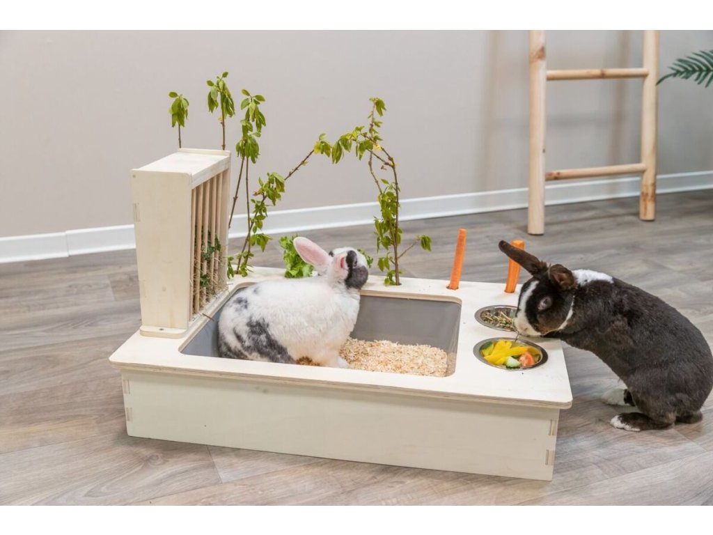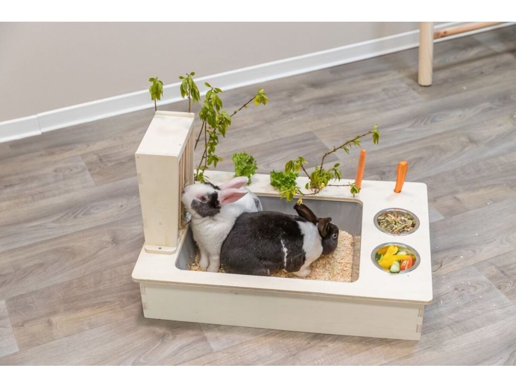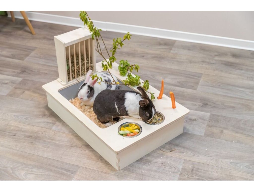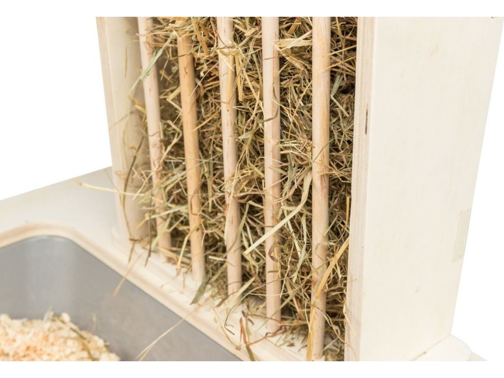 - krmný bar se 2 nerezovými miskami a jesličkami na seno