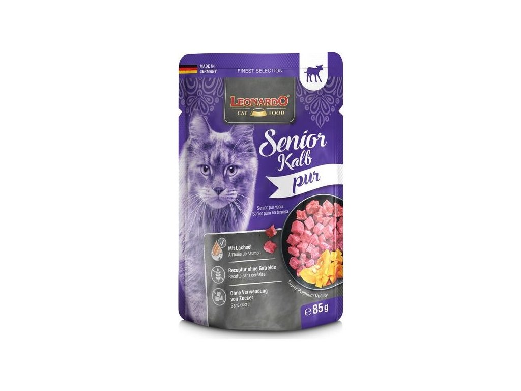 LEONARDO Finest Selection Senior Calf pure je jak již název napovídá vhodné krmení pro kočičího seniora. Díky lahodné chuti čerstvého telecího masa, kterého kapsička obsahuje až 60% a telecího vývaru, který je v kapsičce z 30% budete mít jistotu, že zachutná i největším kočičím gurmánům.