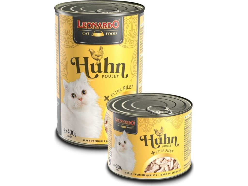 Kuřecí konzerva pro kočky s masem vařeným ve vlastní šťávě, s extra porcí kuřecího filetu a lososovým olejem. Kompletní krmivo pro kočky.