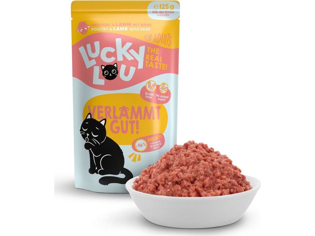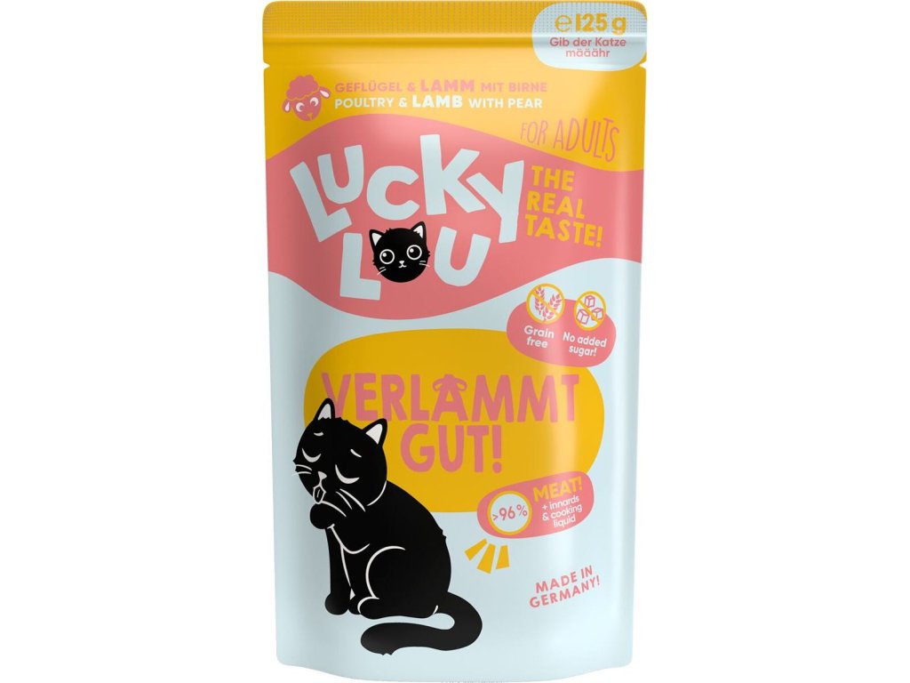Co kočky vlastní chtějí? Jsou to ti nejlepší lovci na světě a opravdoví masožravci. A přesně na tomto základu byla stvořena řada krmiva Lucky Lou Lifestage. kompletní krmivo pro opravdové masožravce – se spoustou masa, vnitřností a vývaru neobsahuje obiloviny, lepek a přidaný cukr stravitelná receptura vhodná i pro citlivé zažívání vyrobeno v Německu k dostání i ve speciálních variantách pro koťata, kočky seniory a kastrované kočky se sníženou potřebou energie Z čeho se skládá přirozená strava kočky? Představme si to na příkladu myši jako typické kočičí kořisti, kterou by vaši miláčci jedli, kdyby neměli jejich starostlivé opatrovatele – vás. Myš se skládá z přibližně 60 % masa, 35 % vedlejších živočišných produktů (srdce, plíce, kosti atd.) a 5 % sacharidů, s vlhkostí asi 70 %. Krmivo Lucky Lou samozřejmě není z myší, ale jeho složení se tomuto přirozenému vzorci maximálně podobá a je ještě lahodnější a zdravější! Vybere si každý! Tato řada krmiva je speciálně přizpůsobena různým fázím kočičího života a jejich individuálním potřebám. Protože kotě potřebuje jiné množství živin než dospělá kočka a stejně tak kočky v nejlepších letech mají jiné nároky na krmivo než kočky seniorky. Zároveň zde najdete i speciální varianty pro kastrované kočky a gaučové povaleče – se sníženým obsahem tuku a L-karnitinem. Složení: drůbeží maso 60 % (srdce, svalovina, játra, žaludek, krk, tuk), drůbeží a jehněčí vývar 26,8 %, jehněčí maso 10 %, hrušky 2 %, minerální látky 1 %, brutnákový olej 0,2 % Analýza: hrubé bílkoviny 10,2 %, hrubé oleje a tuky 5 %, hrubé popeloviny 3 %, hrubá vláknina 0,3 %, vlhkost 80 % Doplňkové nutriční látky: vitamin D3 200 I.E/IU/UI, zinek (3b605) 25 mg, mangan (3b503) 1,4 mg, měď (3b405) 1 mg, taurin (3a370) 1500 mg Hrušky jsou bohaté na vlákninu, která podporuje správné trávení a pravidelné vyprazdňování. Zároveň jsou zdrojem celé řady vitamínů a minerálů. Brutnákový olej je bohatým zdrojem kvalitních omega-3 mastných kyselin a pomáhá udržovat zdravou srst a podporuje správnou funkci srdce. Doporučené dávkování: Krmná dávka vždy závisí na aktivitě, věku, velikosti, plemenu a zdraví kočky. Doporučujeme podávat v menších porcích, dle potřeby, 3–5% tělesné hmotnosti kočky denně. Datum minimální trvanlivosti a číslo šarže najdete na zadní straně obalu. Krmivo skladujte v suchu. Po otevření skladujte v lednici a co nejdříve spotřebujte. Hmotnost: 125 g
