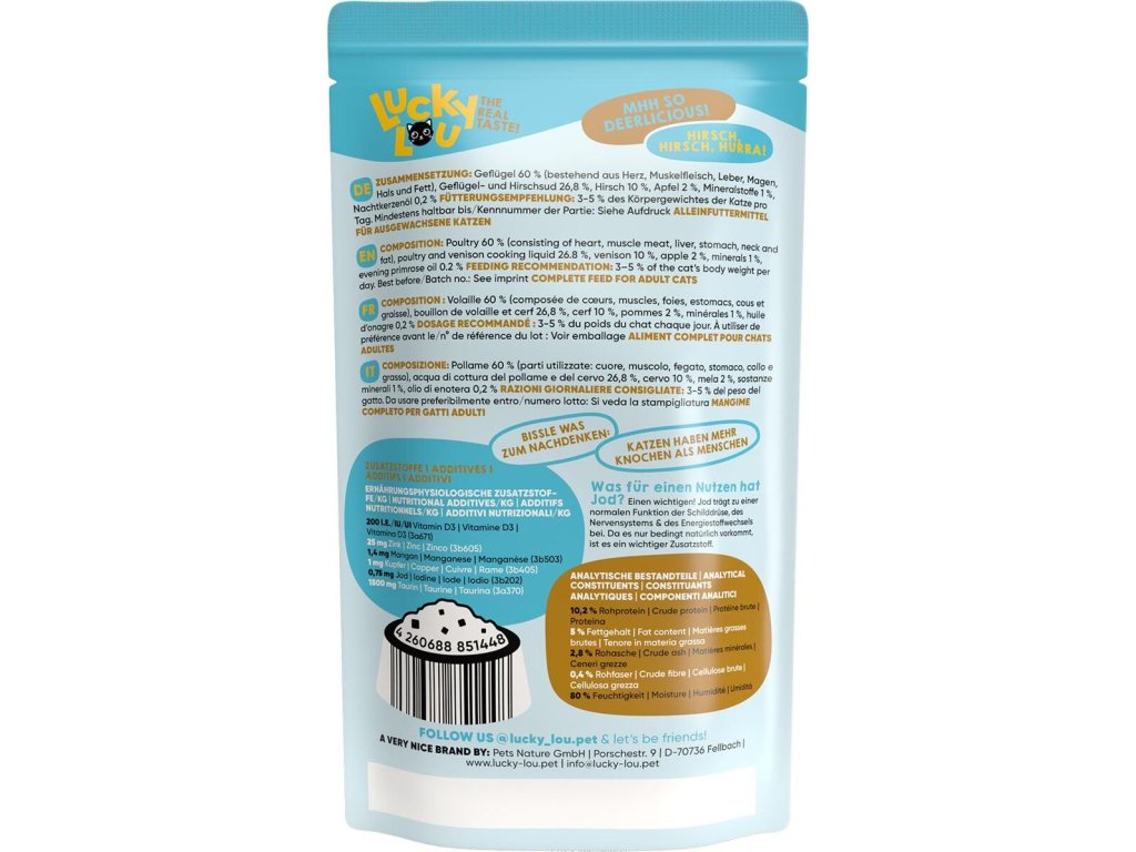 Co kočky vlastní chtějí? Jsou to ti nejlepší lovci na světě a opravdoví masožravci. A přesně na tomto základu byla stvořena řada krmiva Lucky Lou Lifestage. kompletní krmivo pro opravdové masožravce – se spoustou masa, vnitřností a vývaru neobsahuje obiloviny, lepek a přidaný cukr stravitelná receptura vhodná i pro citlivé zažívání vyrobeno v Německu k dostání i ve speciálních variantách pro koťata, kočky seniory a kastrované kočky se sníženou potřebou energie Z čeho se skládá přirozená strava kočky? Představme si to na příkladu myši jako typické kočičí kořisti, kterou by vaši miláčci jedli, kdyby neměli jejich starostlivé opatrovatele – vás. Myš se skládá z přibližně 60 % masa, 35 % vedlejších živočišných produktů (srdce, plíce, kosti atd.) a 5 % sacharidů, s vlhkostí asi 70 %. Krmivo Lucky Lou samozřejmě není z myší, ale jeho složení se tomuto přirozenému vzorci maximálně podobá a je ještě lahodnější a zdravější! Vybere si každý! Tato řada krmiva je speciálně přizpůsobena různým fázím kočičího života a jejich individuálním potřebám. Protože kotě potřebuje jiné množství živin než dospělá kočka a stejně tak kočky v nejlepších letech mají jiné nároky na krmivo než kočky seniorky. Zároveň zde najdete i speciální varianty pro kastrované kočky a gaučové povaleče – se sníženým obsahem tuku a L-karnitinem. Složení: drůbeží maso 60 % (srdce, svalovina, játra, žaludek, krk, tuk), vývar z drůbeže a jelena 26,8 %, jelen 10 %, jablka 2 %, minerální látky 1 %, pupalkový olej 0,2 % Analýza: hrubé bílkoviny 10,2 %, hrubé oleje a tuky 5 %, hrubé popeloviny 2,8 %, hrubá vláknina 0,4 %, vlhkost 80 % Doplňkové nutriční látky: vitamin D3 200 I.E/IU/UI, zinek (3b605) 25 mg, mangan (3b503) 1,4 mg, měď (3b405) 1 mg, jód (3b202) 0,75 mg, taurin (3a370) 1500 mg Jablka jsou vydatným zdrojem vlákniny, minerálů a vitamínů C a A. Nejen tedy, že dobře chutnají, ale celkově pozitivně působí na imunitní systém psa a jeho zažívání. Pupalkový olej je výborný zdroj mastných kyselin omega-3, které podporují zdravou srst a pokožku, předcházejí vznikům zánětů a celkově prospívají zdraví kočky. Doporučené dávkování: Krmná dávka vždy závisí na aktivitě, věku, velikosti, plemenu a zdraví kočky. Doporučujeme podávat v menších porcích, dle potřeby, 3–5% tělesné hmotnosti kočky denně. Datum minimální trvanlivosti a číslo šarže najdete na zadní straně obalu. Krmivo skladujte v suchu. Po otevření skladujte v lednici a co nejdříve spotřebujte. Hmotnost: 125 g